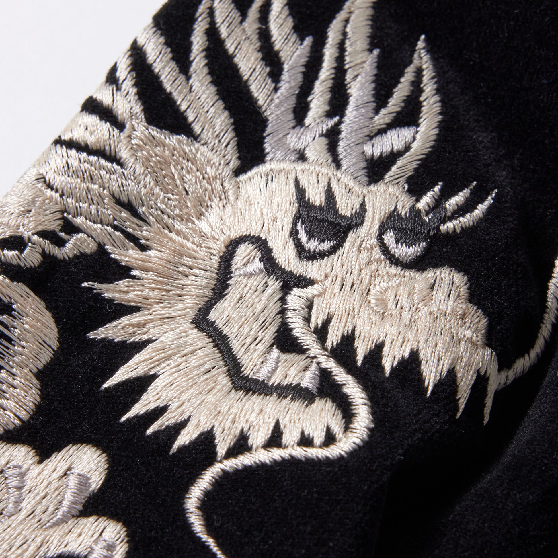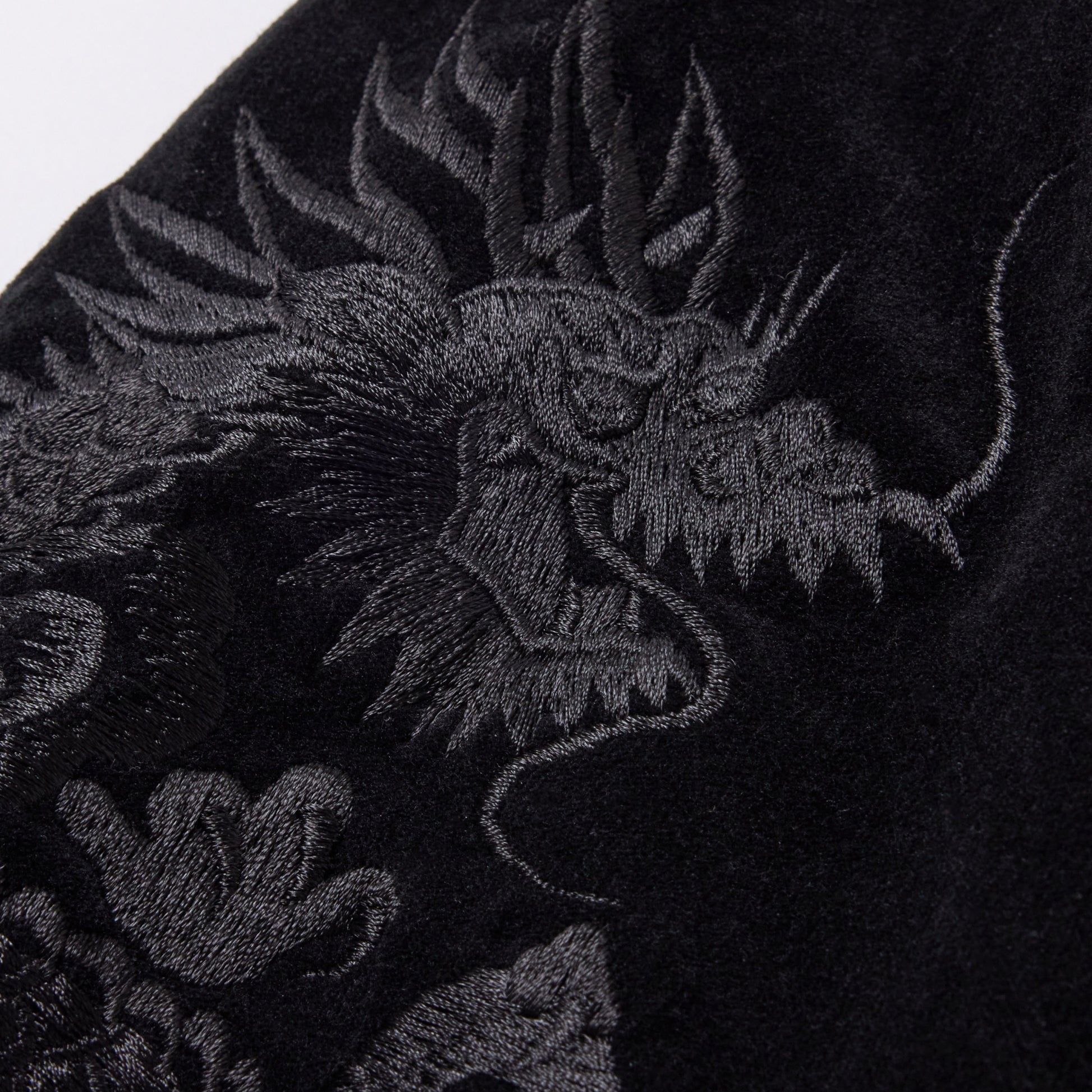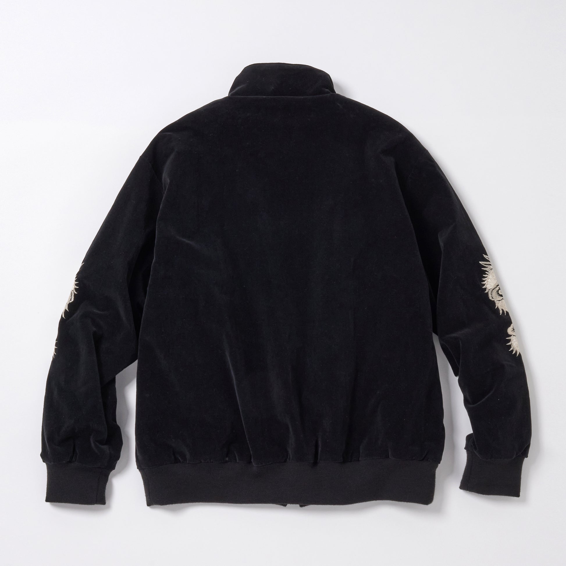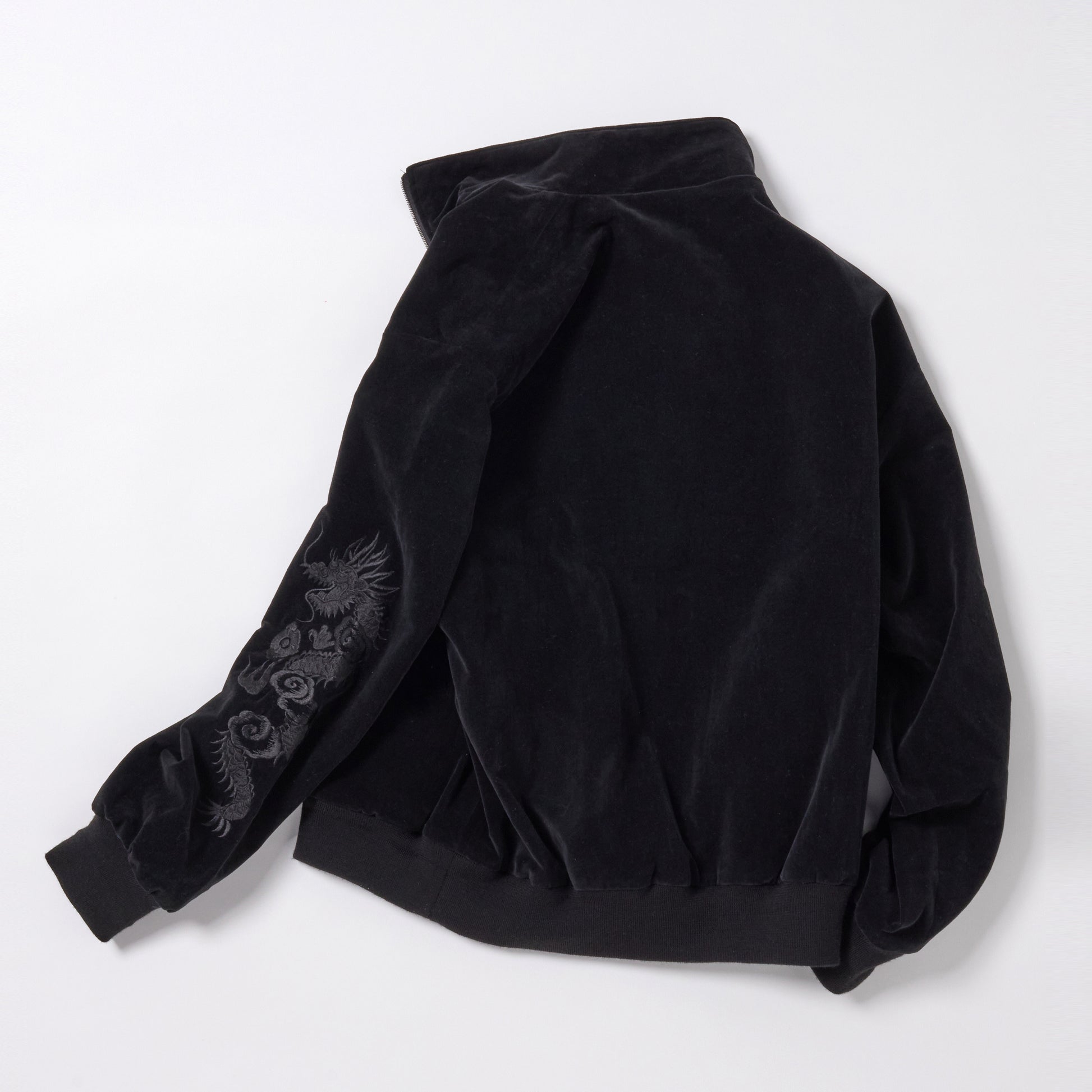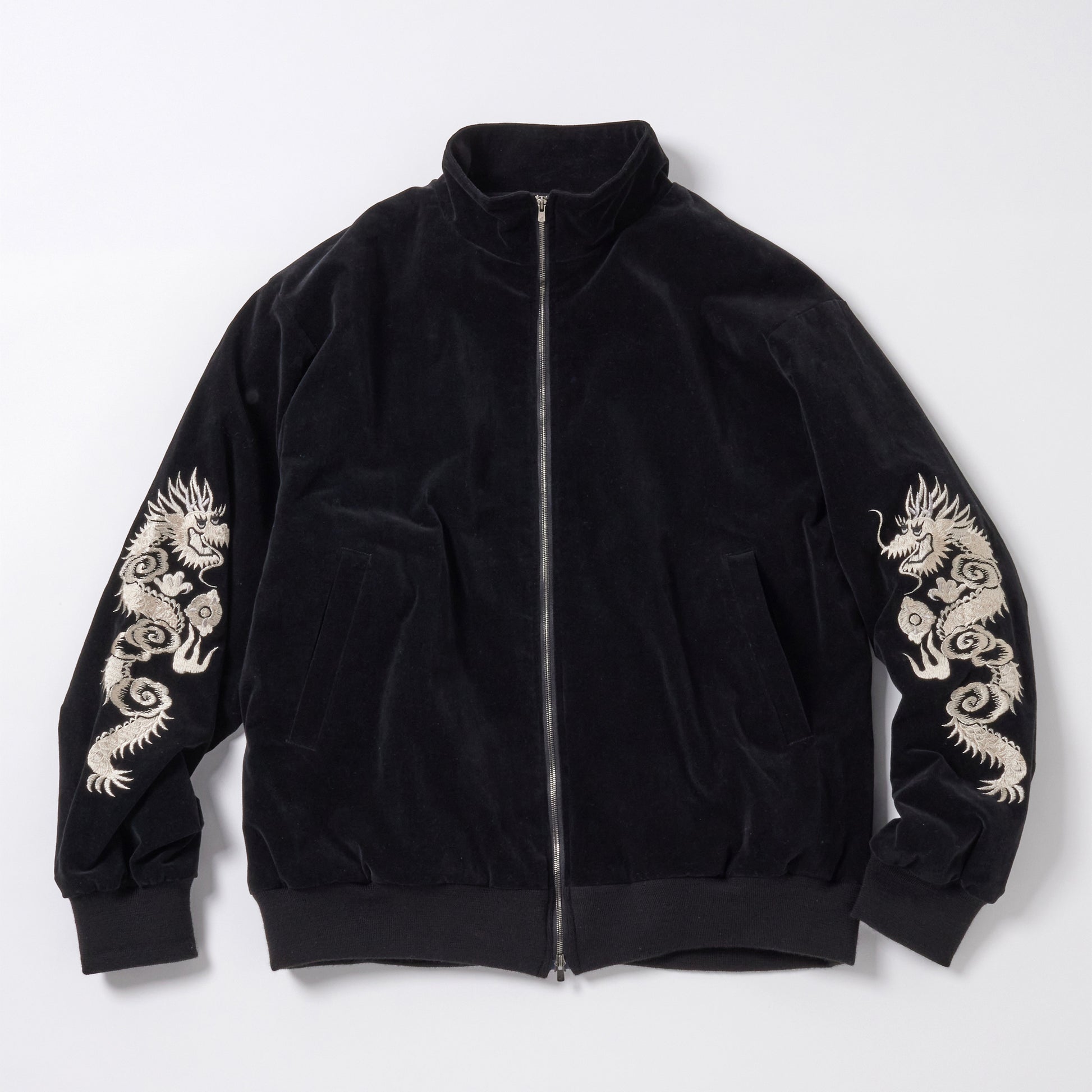 ストレッチ別珍素材を使用したトラックジャケットはブランド定番型。裏地には光沢感や肌触りに優れた100番手双糸のモールスキン地を採用。フロントジッパーには EXCELLA®ファスナーを使用している。袖部分に入る龍の刺繍は、オフホワイトベースとブラックベースの2色展開で、パンツとのセットアップでの着用も可能。