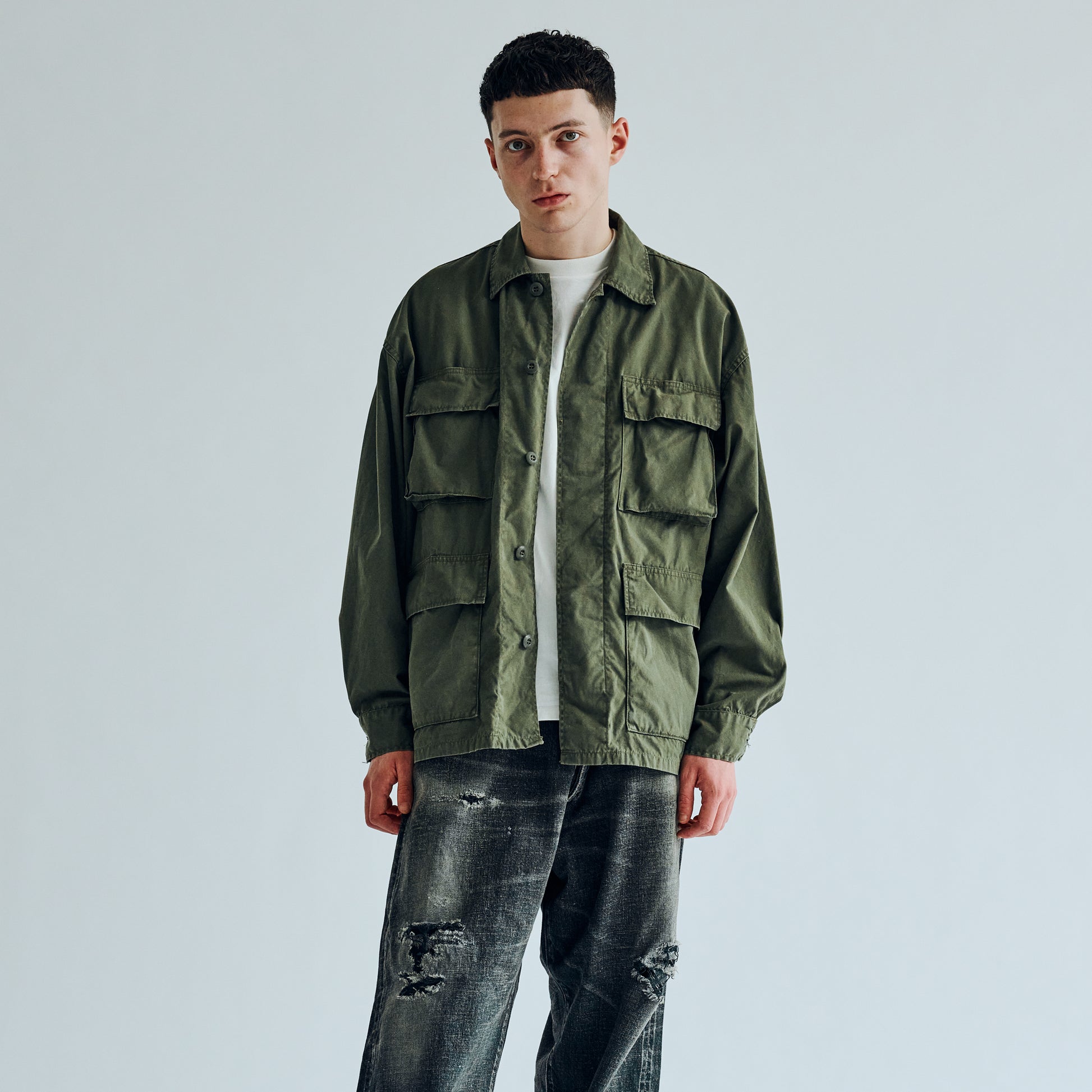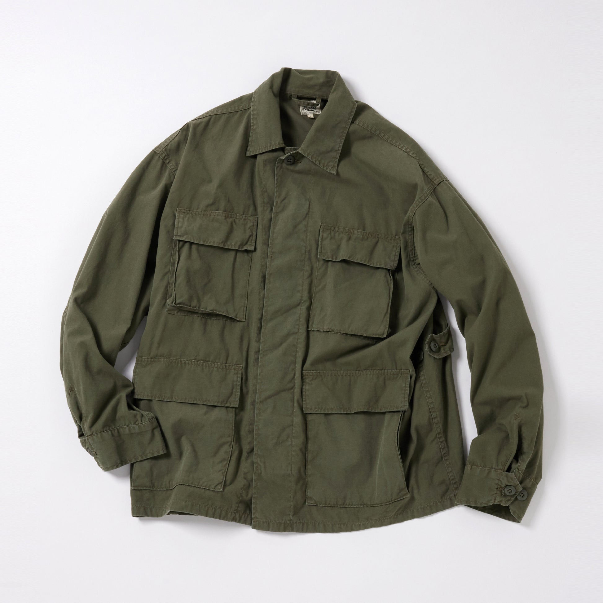 1960年代のベトナム戦争時に米陸軍に導入された、ベトナム戦域の高温多湿な気候に対応すべく開発されたジャケット。40番手双糸を高密度に織り上げたコットンウェザークロスは、軽量で乾きやすく自然な撥水性も持ち合わせた素材。ブランド特有のドロップショルダーで身幅とアームホールを広くとったビッグシルエットで、身頃の大きさに合わせて胸と腰に付いた立体型ポケットも大型に改良している。腰のフラップポケットは二重構造になっており、ハンドウォームポケットも装備。