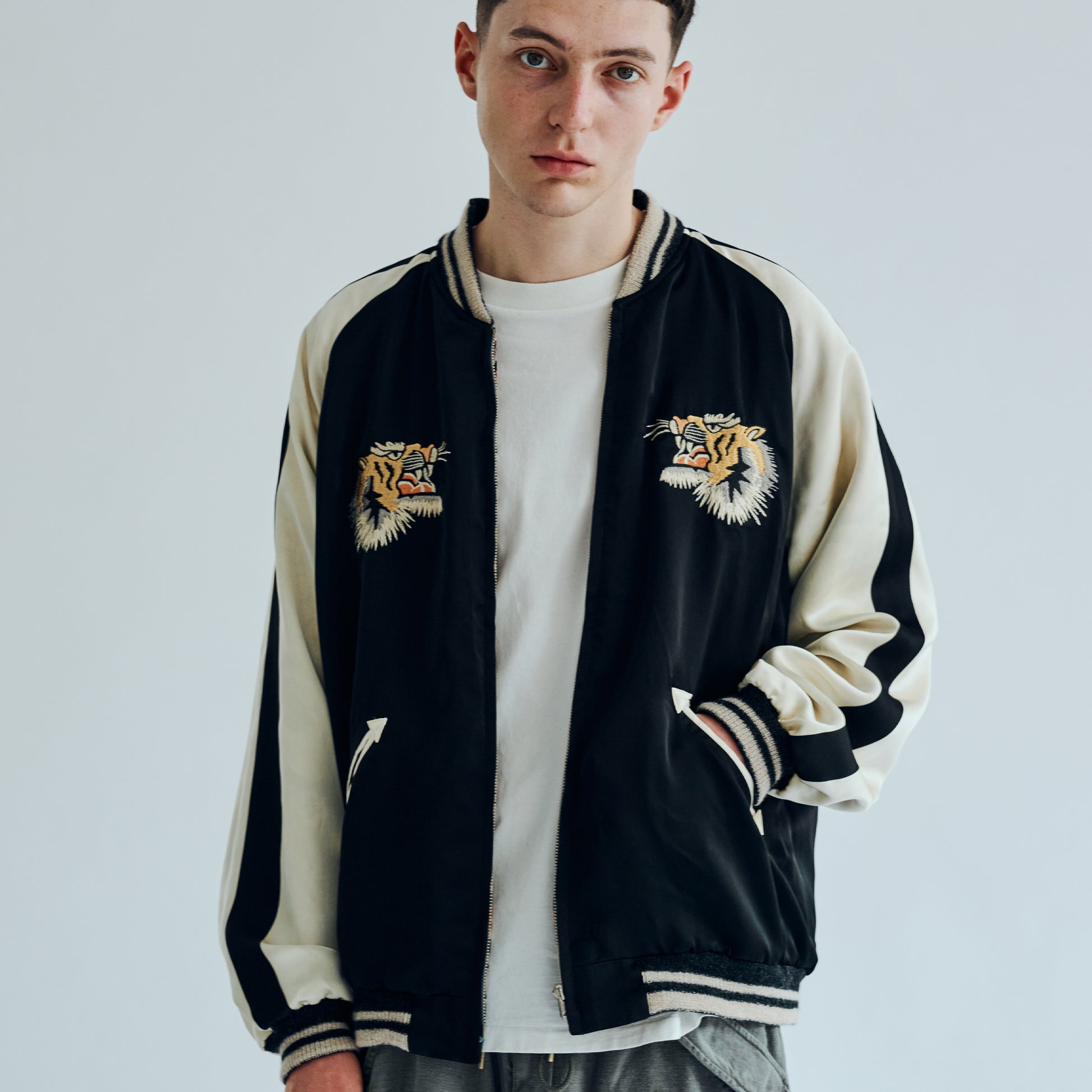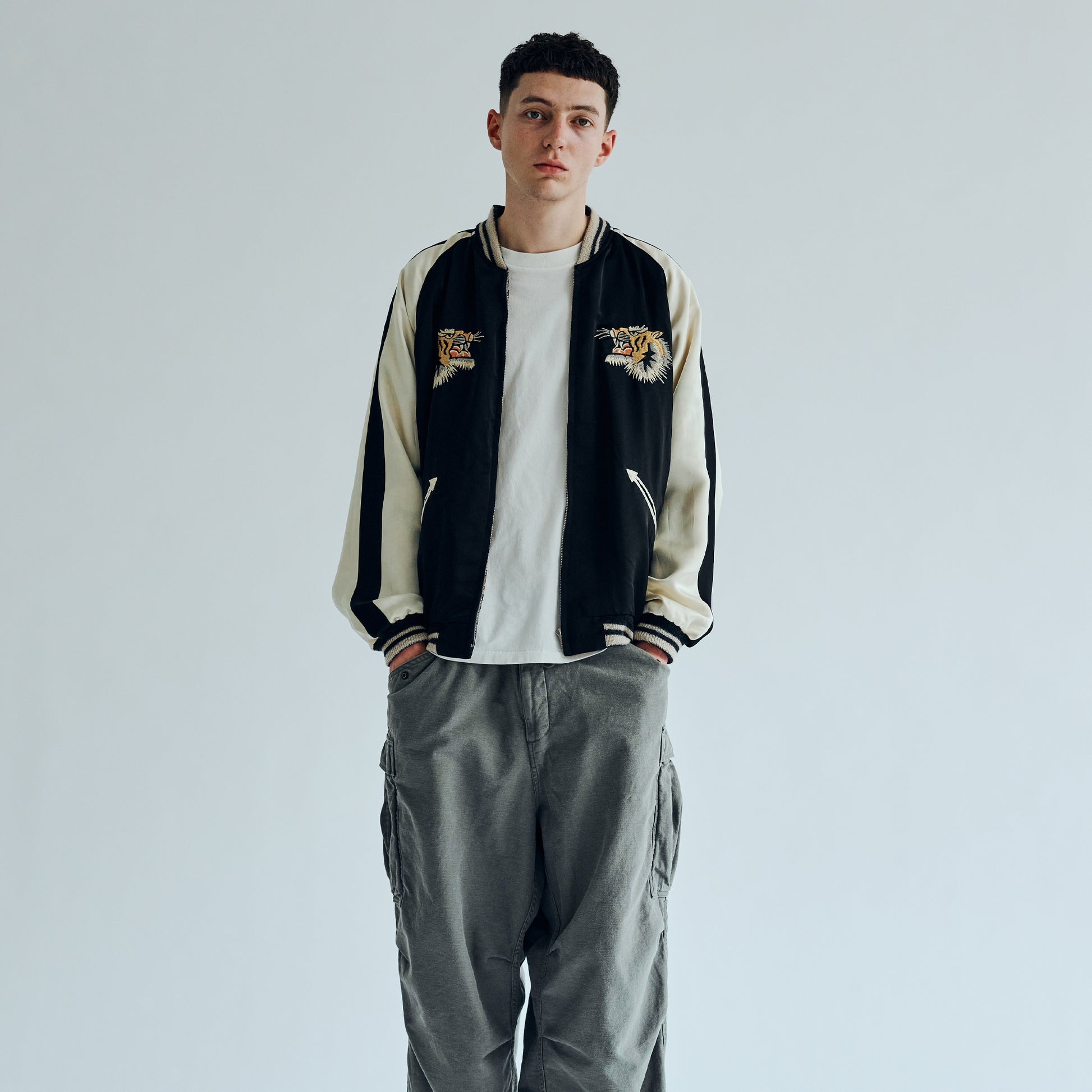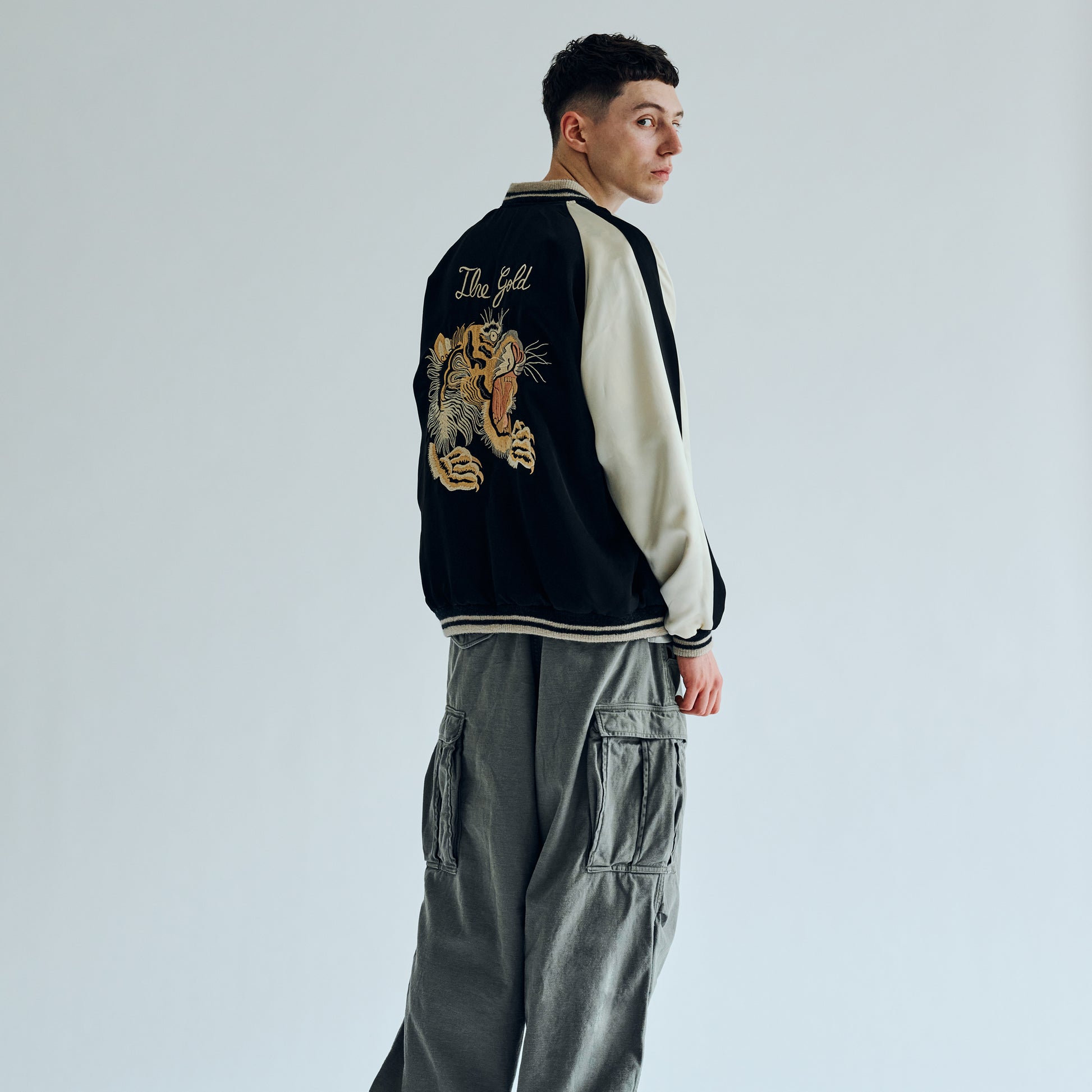 生地、プリント、刺繍、リブ、ファスナー、縫製、すべてを日本で製作したスペシャルエディションのスーベニアジャケット。東洋エンタープライズが長年培ってきたプリント技術を駆使し、ヴィンテージアロハシャツの中でも希少価値の高い「百虎」をアセテートサテン生地にプリントしている。17頭の虎によって構成されるデザインの、1万本を超える虎斑の毛をすべて正確に数え、型を起こし忠実に再現。