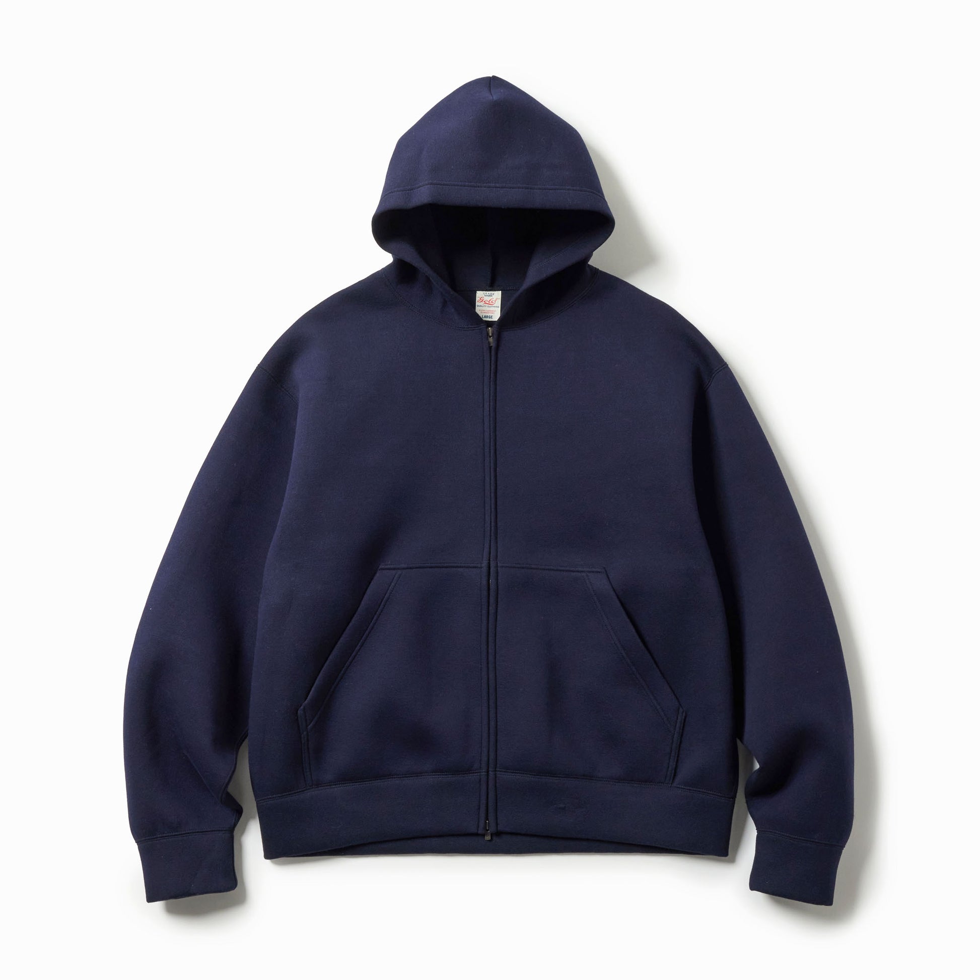 表生地と裏生地の2枚の布を中糸でつなぎ合わせて編んだニット素材のフルジップパーカーは、軽量でハリがあり、シワになりにくく保温性に優れたアイテム。大きめのフロントポケットやEXCELLA製ダブルジッパーを使用しているのも特徴。