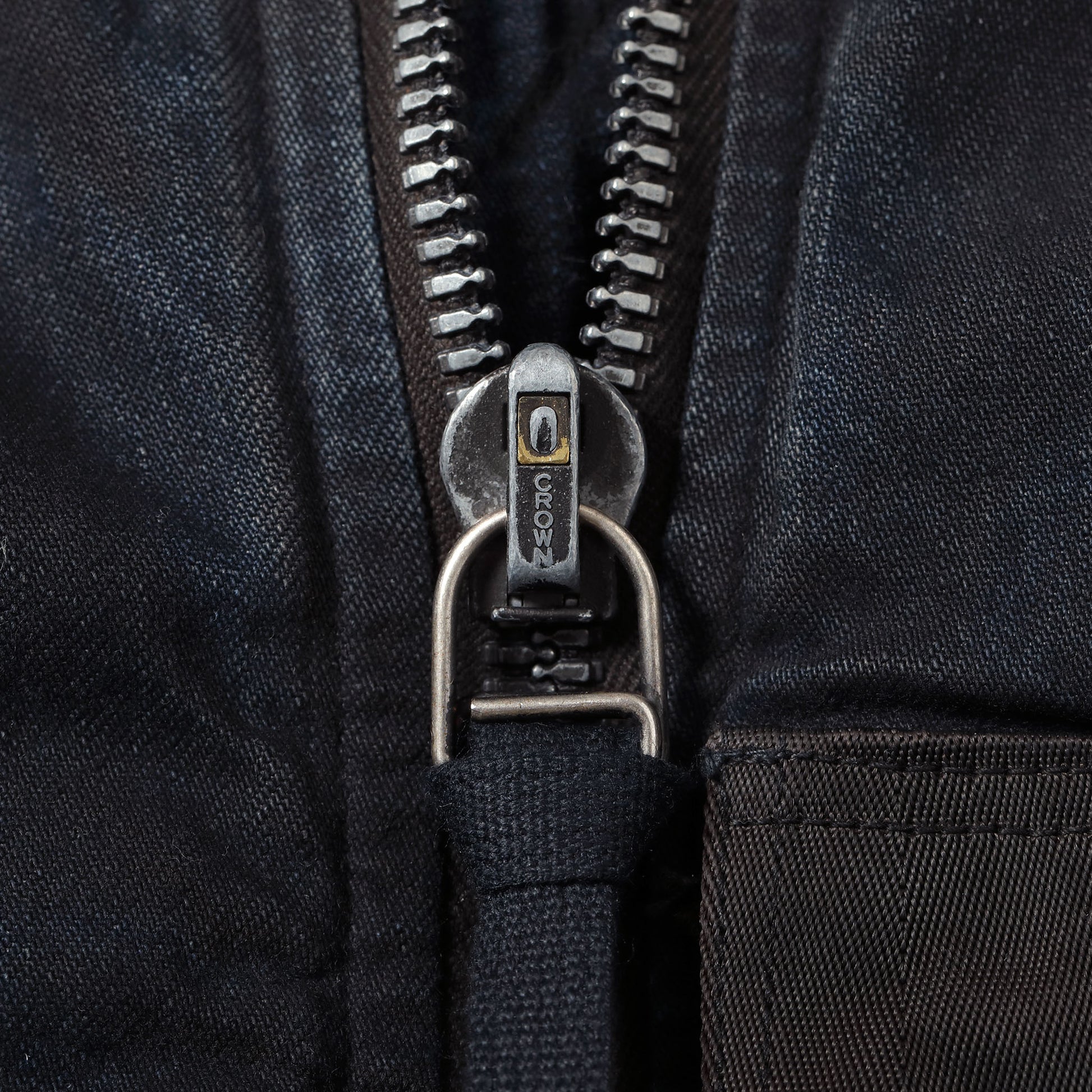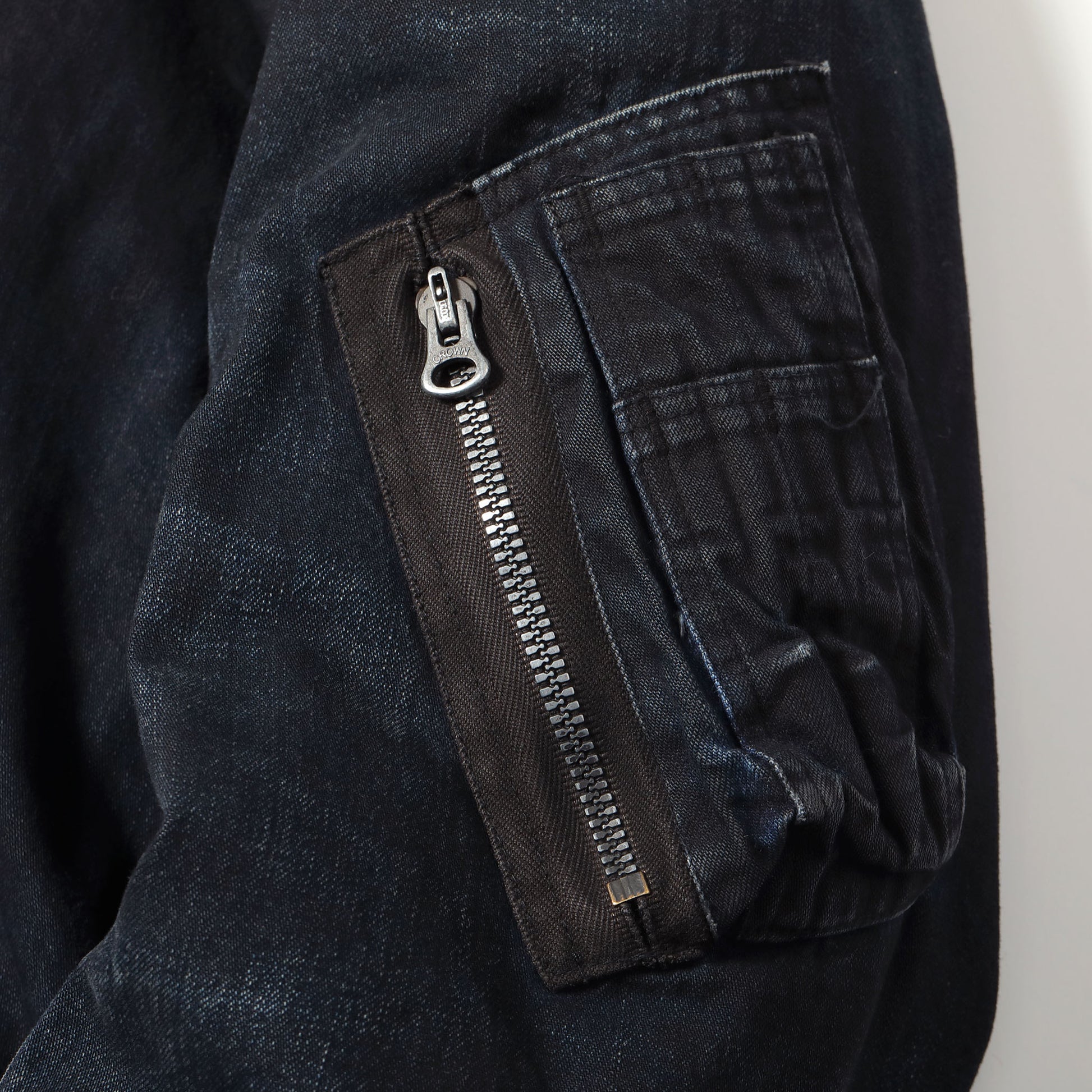 インディゴデニムの上に黒顔料を吹き付け、擦りを入れることによりインディゴとブラックの深みのある色合いが魅力のMA-1。ファスナーはCROWNファスナーを採用。アルミ合金のスライダーとなっており、エレメント部分は一般的なプレス式ではなく高圧鋳造法を用いて滑りやすくした。中綿には現アメリカ軍で使用されている米国製の高機能綿であるCLIMASHIELD(クライマシールド)を用いることで軽量かつ保温性や防湿性、形状保持に優れた内容に。