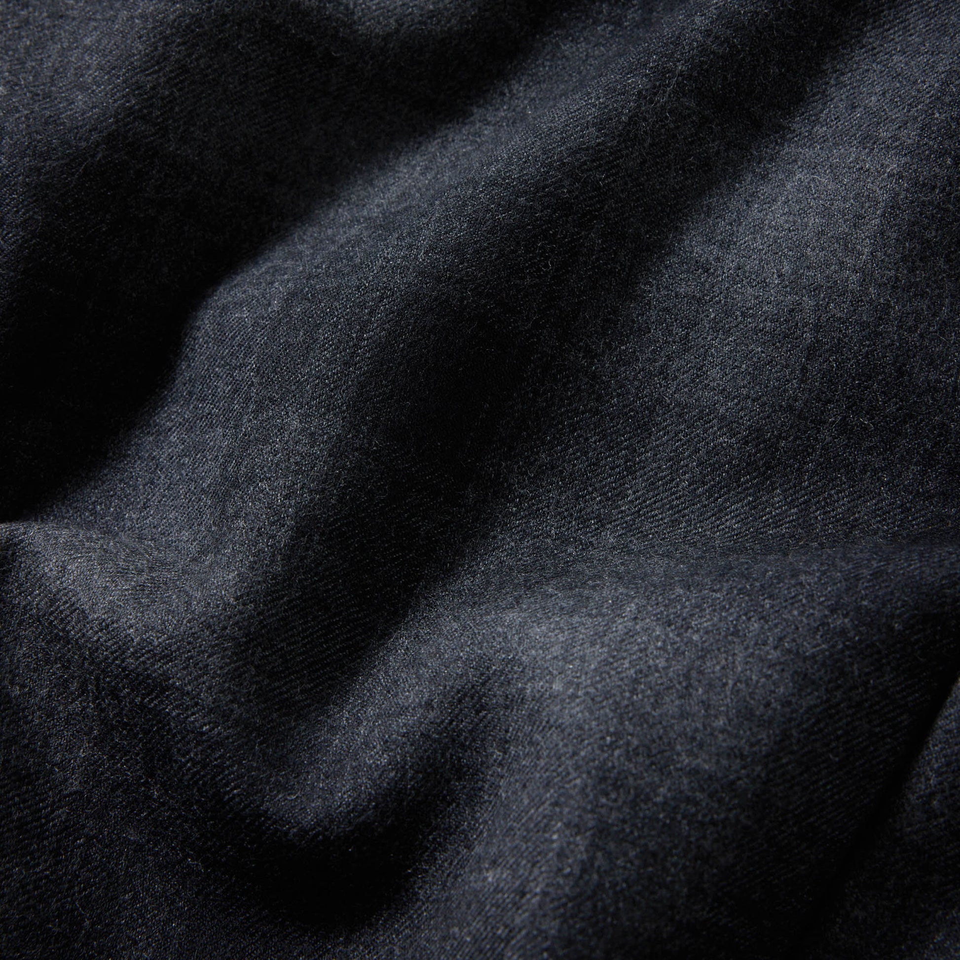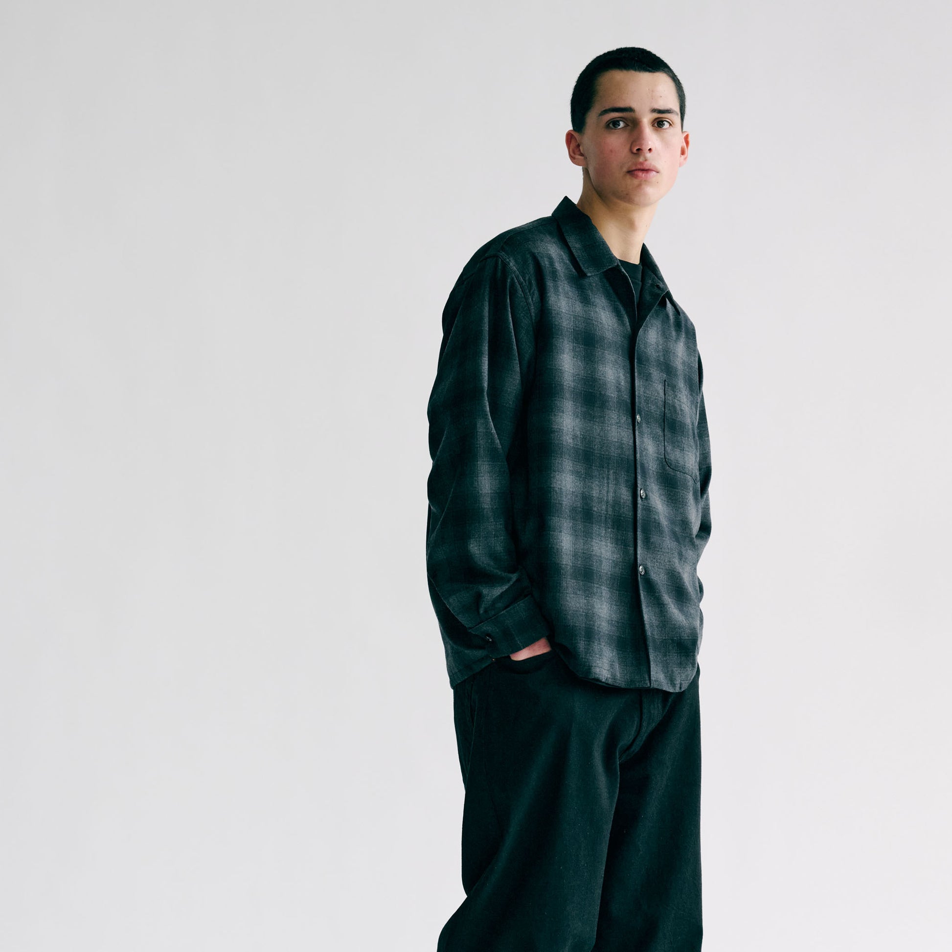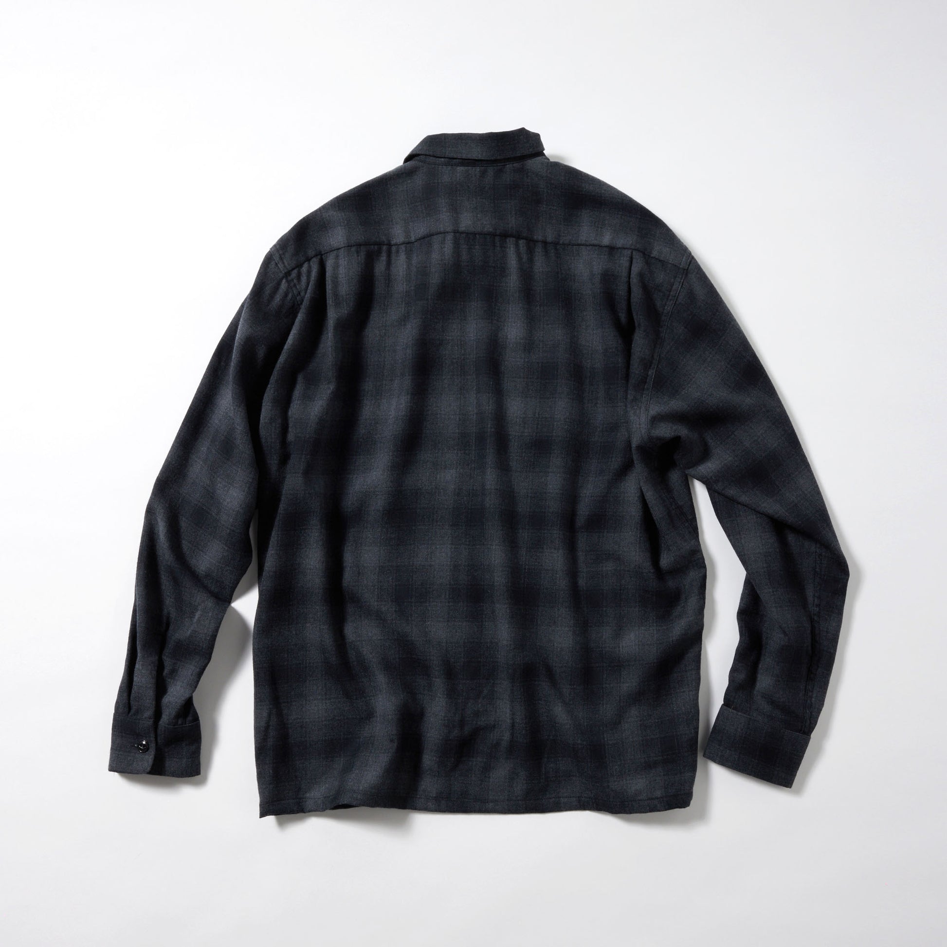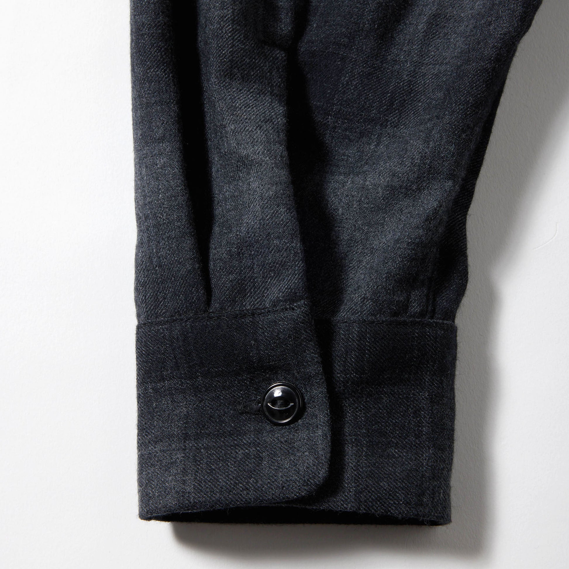 上質なウールビエラチェックの生地は、黒×杢チャコール×杢グレーの糸で構成されたモノトーンチェックのオリジナル素材。ブランド定番のボックス型シルエット。