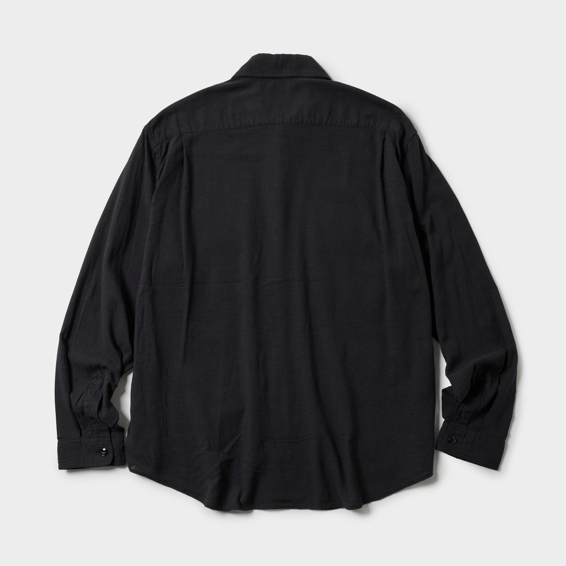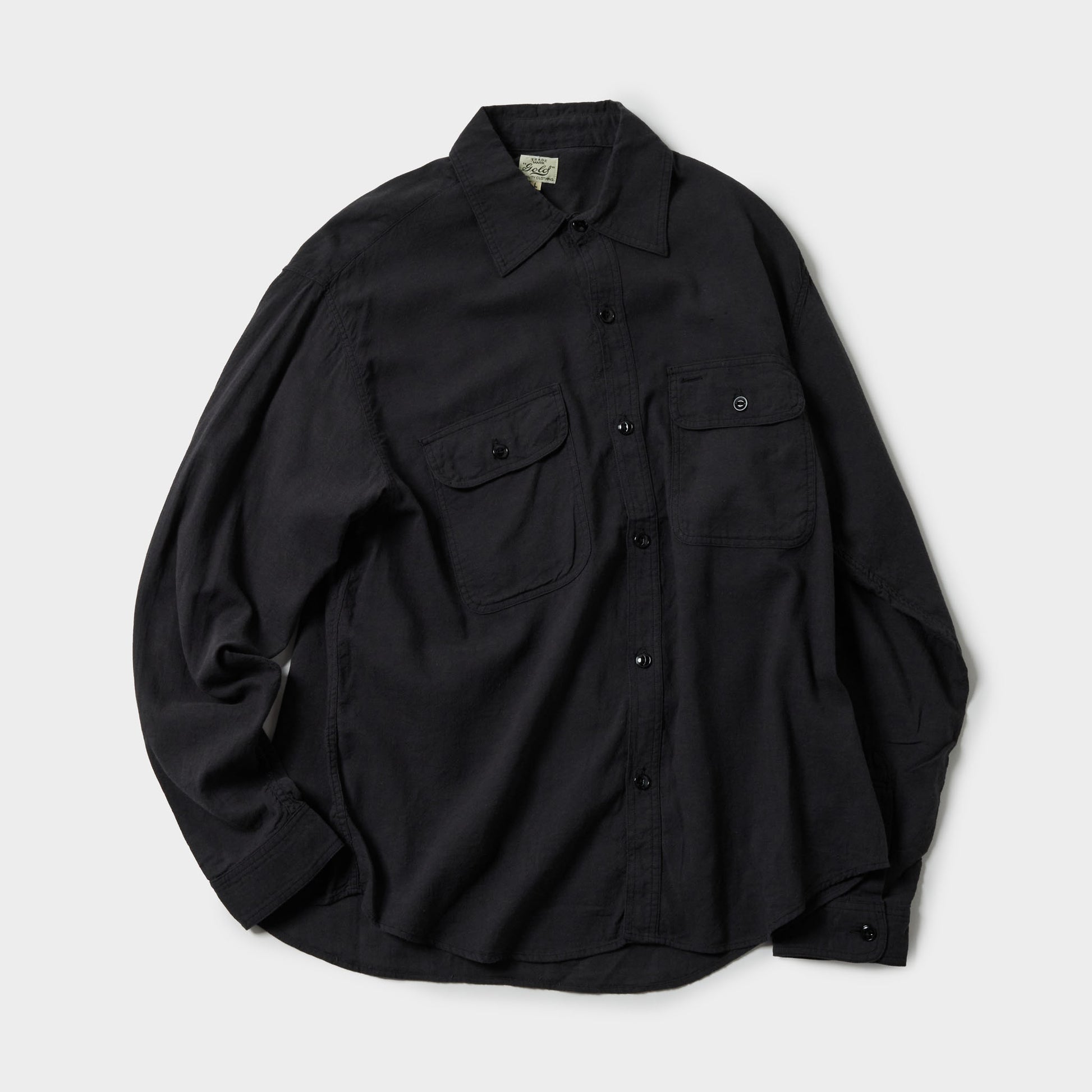 空気紡績機によって撚られた糸をシャトル織機で織り上げたオリジナルのオックスフォード素材。シャトル織機で甘く織り上げる事により、ふっくらとした肌触りと軽やかさが特徴。2本針巻き縫いの縫製仕様で作られた定番のワークシャツは、フラップ付き仕様の胸ポケットを採用している。