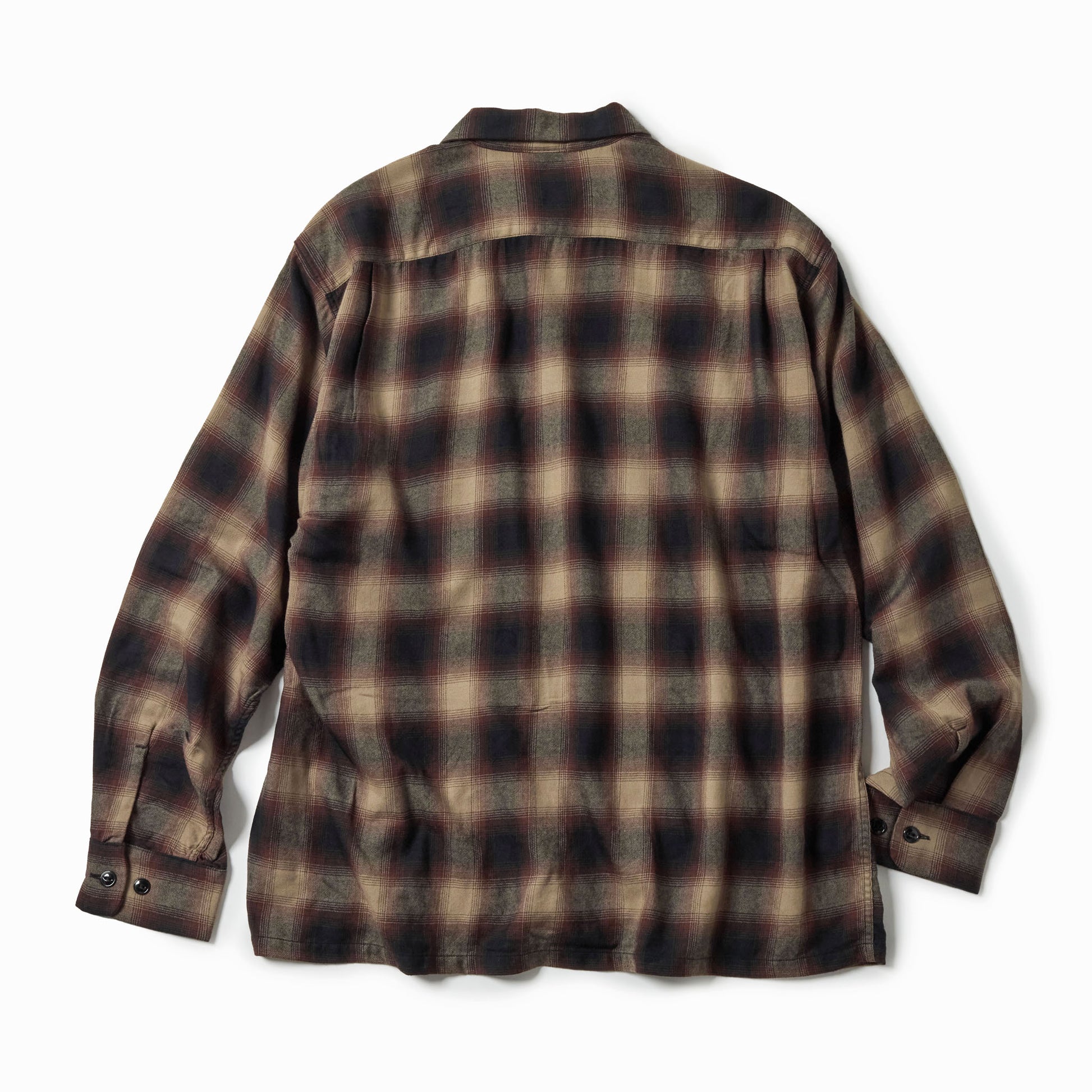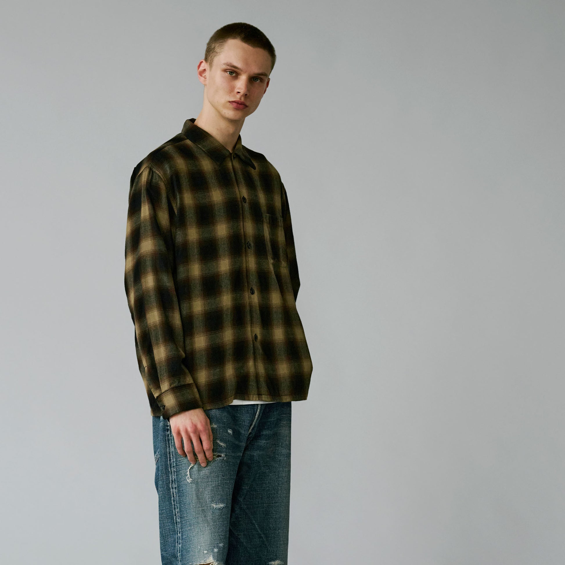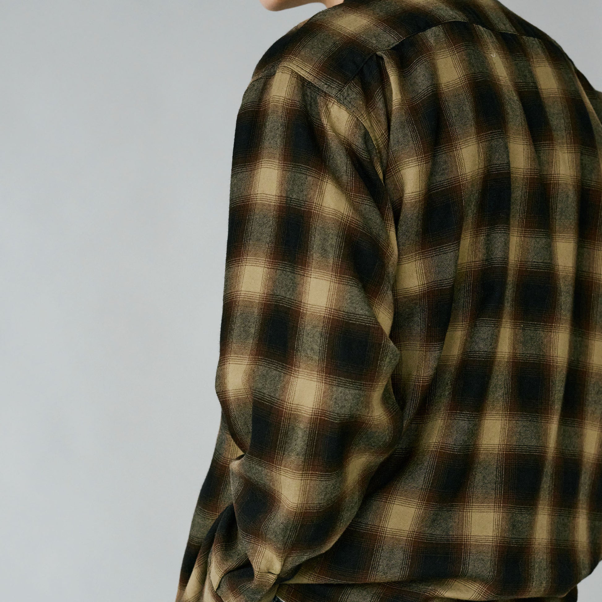 上質なスーパー120ʼsウールで織り上げられた先染めのウールチェック生地。BLACKは絣りチェック、BROWNはオンブレチェックとなっている。定番のボックス型オープンシャツに仕上げた。