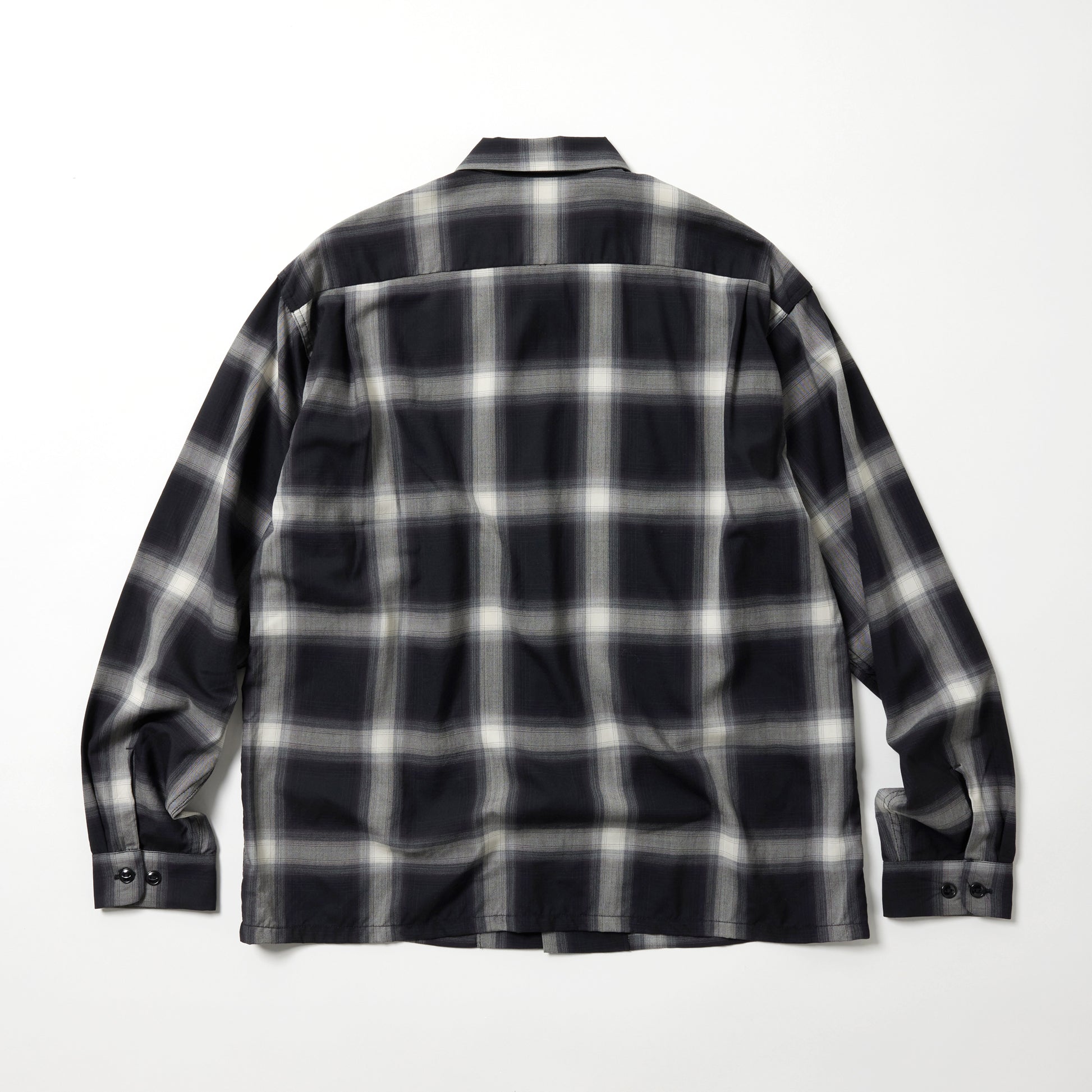 オーストラリア産メリノ種の梳毛糸2/100番手のウールスーパー140ʼsの貴重な高級原料を贅沢に使用し、先染めのオンブレチェックで織り上げたオリジナルのウールトロピカル素材。生地にオゾン防縮加工をする事によって、風合いを損なうことなくシワになり難い素材となっている。定番のボックス型シルエットのオープンシャツは、ポケットや身頃、脇まで細かく柄合わせされ、袖口カフスにボタンを2つ付ける事により、袖開きの調整が可能なディテールとなっている。