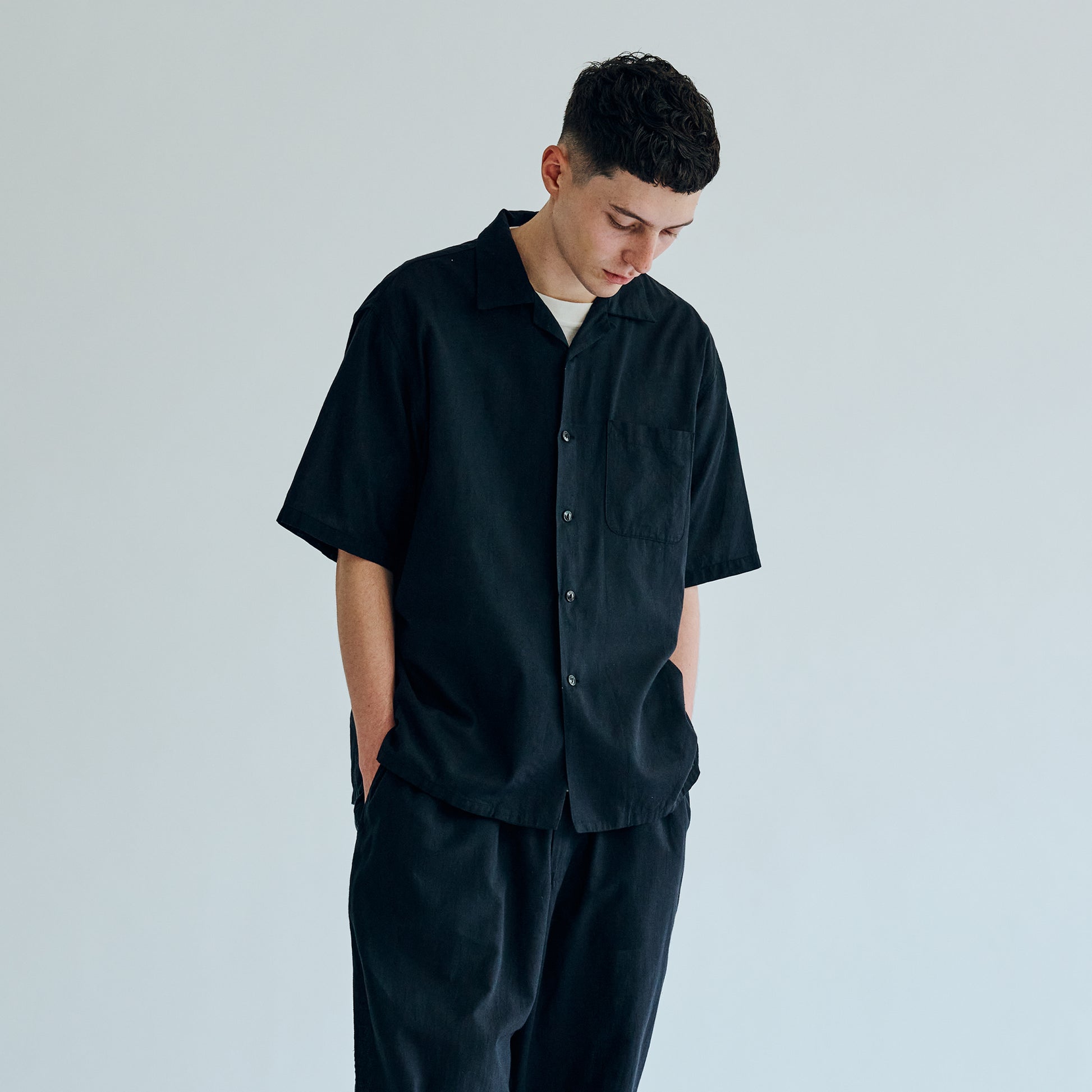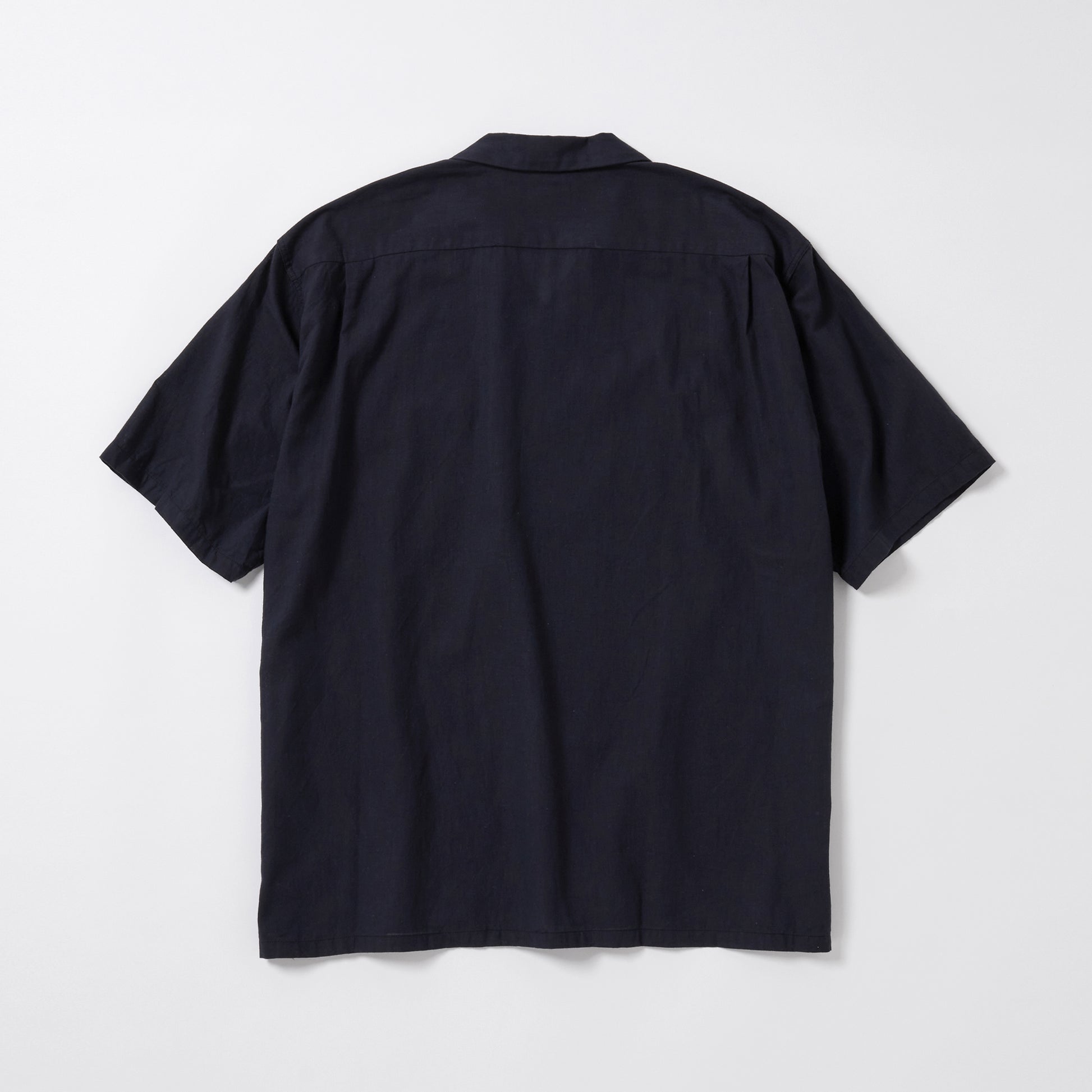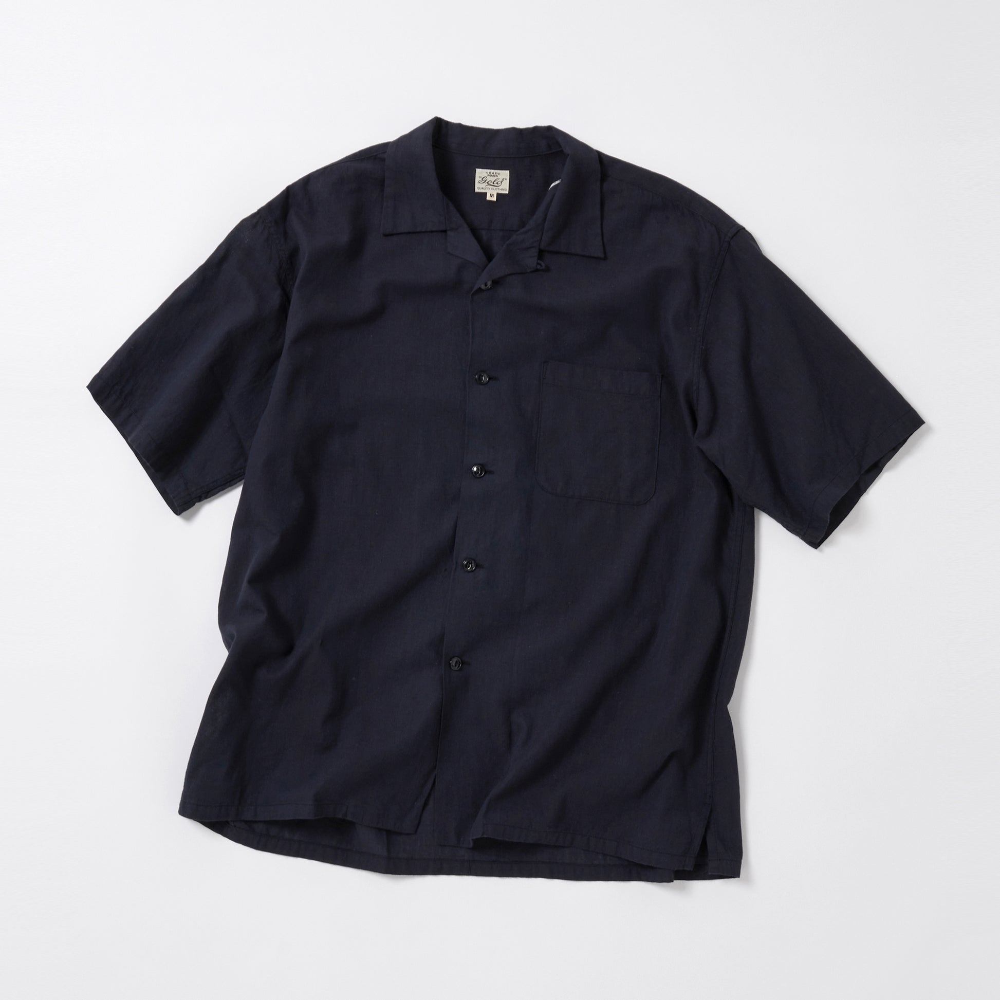 ベタ塗りシャンブレーと呼ばれる、経糸と緯糸に濃淡の色の差が付いた色糸を使用した素材。膨らみとムラ感に特化した30番手単糸をシャトル織機で緩めに織り上げる事によって、ふっくらとした肌触りと軽さが特徴の生地に仕上がった。型はセルビッジを使用した身返しや、裾にスリットが入るブランド定番のオープンシャツタイプ。