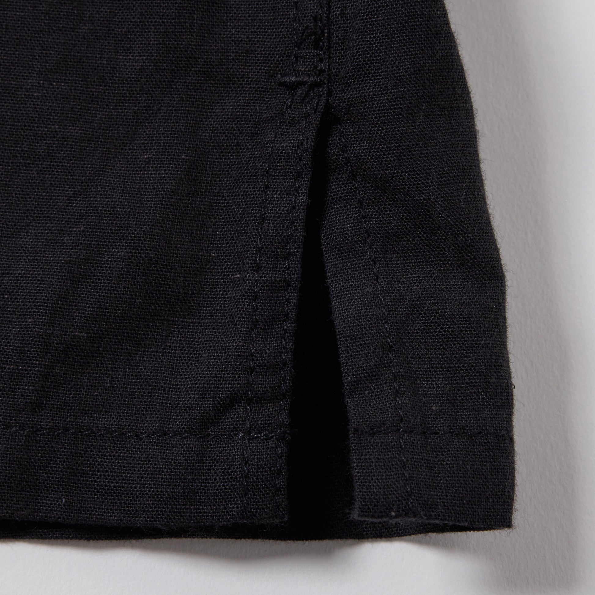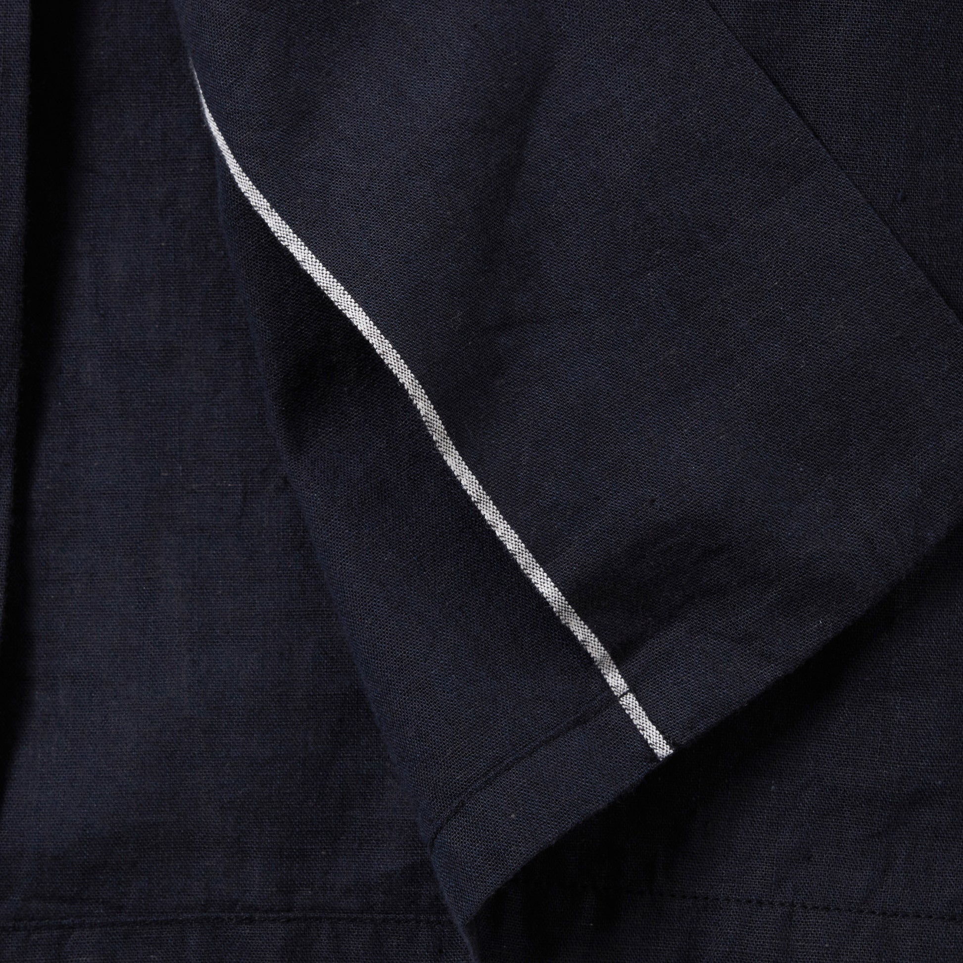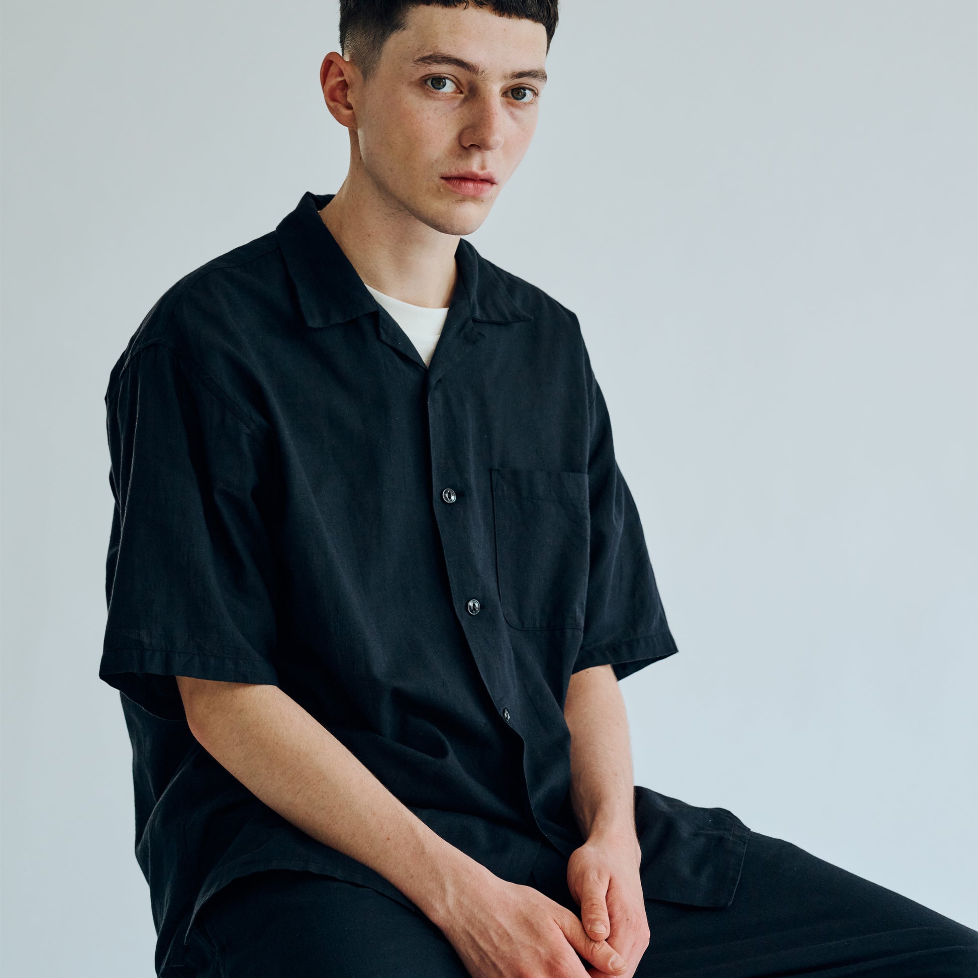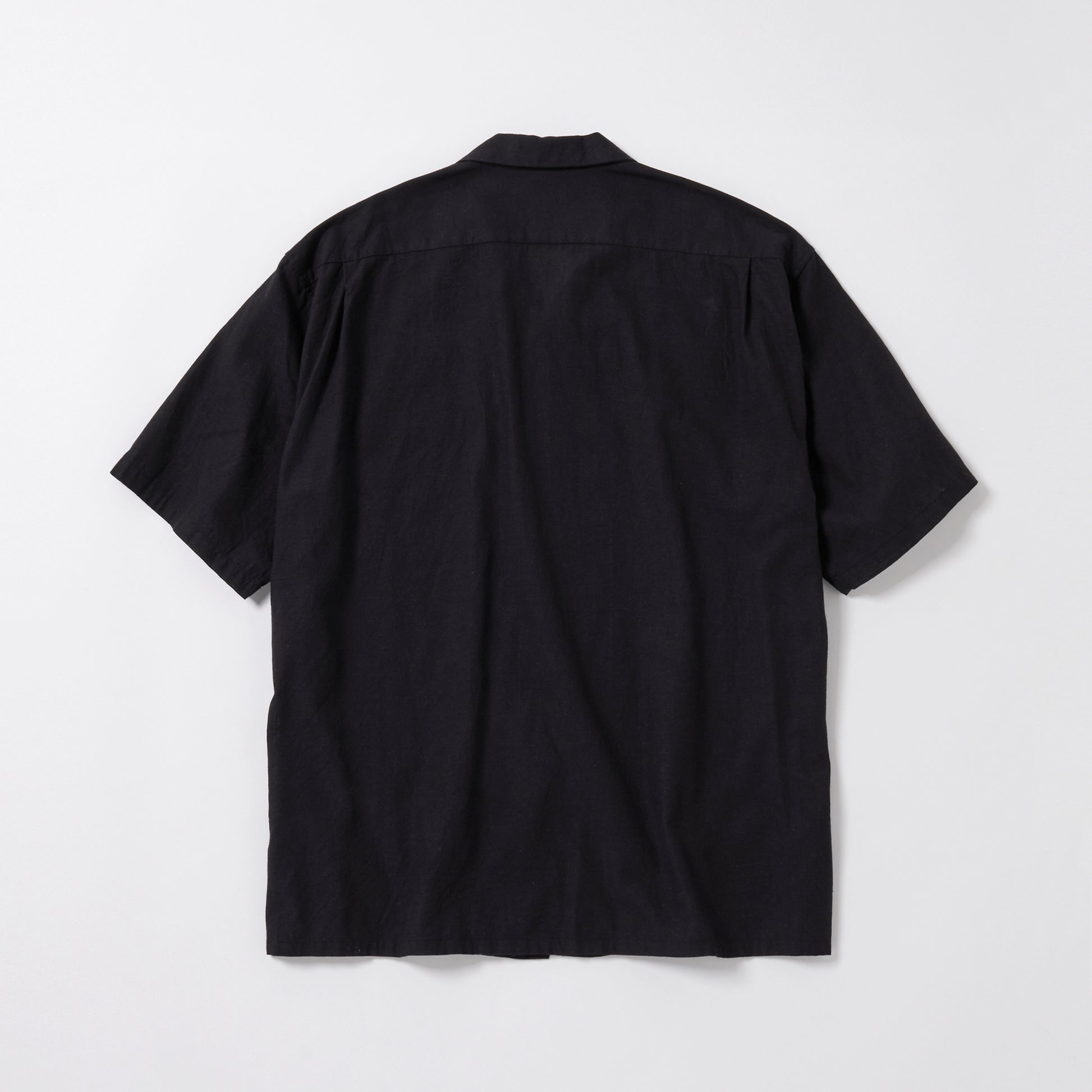 ベタ塗りシャンブレーと呼ばれる、経糸と緯糸に濃淡の色の差が付いた色糸を使用した素材。膨らみとムラ感に特化した30番手単糸をシャトル織機で緩めに織り上げる事によって、ふっくらとした肌触りと軽さが特徴の生地に仕上がった。型はセルビッジを使用した身返しや、裾にスリットが入るブランド定番のオープンシャツタイプ。