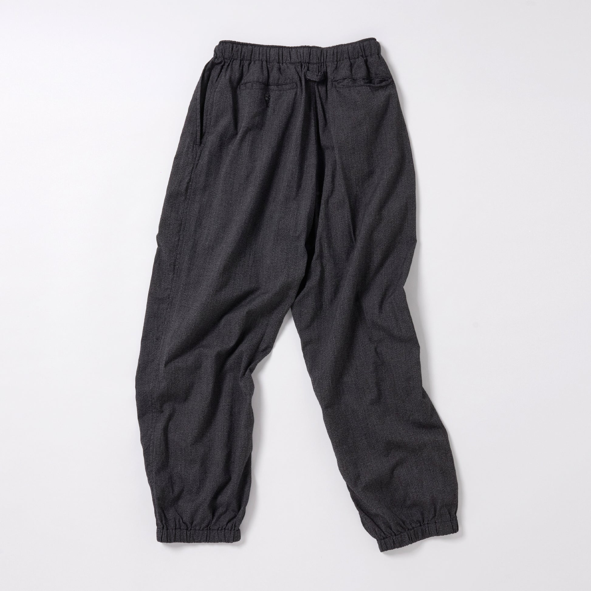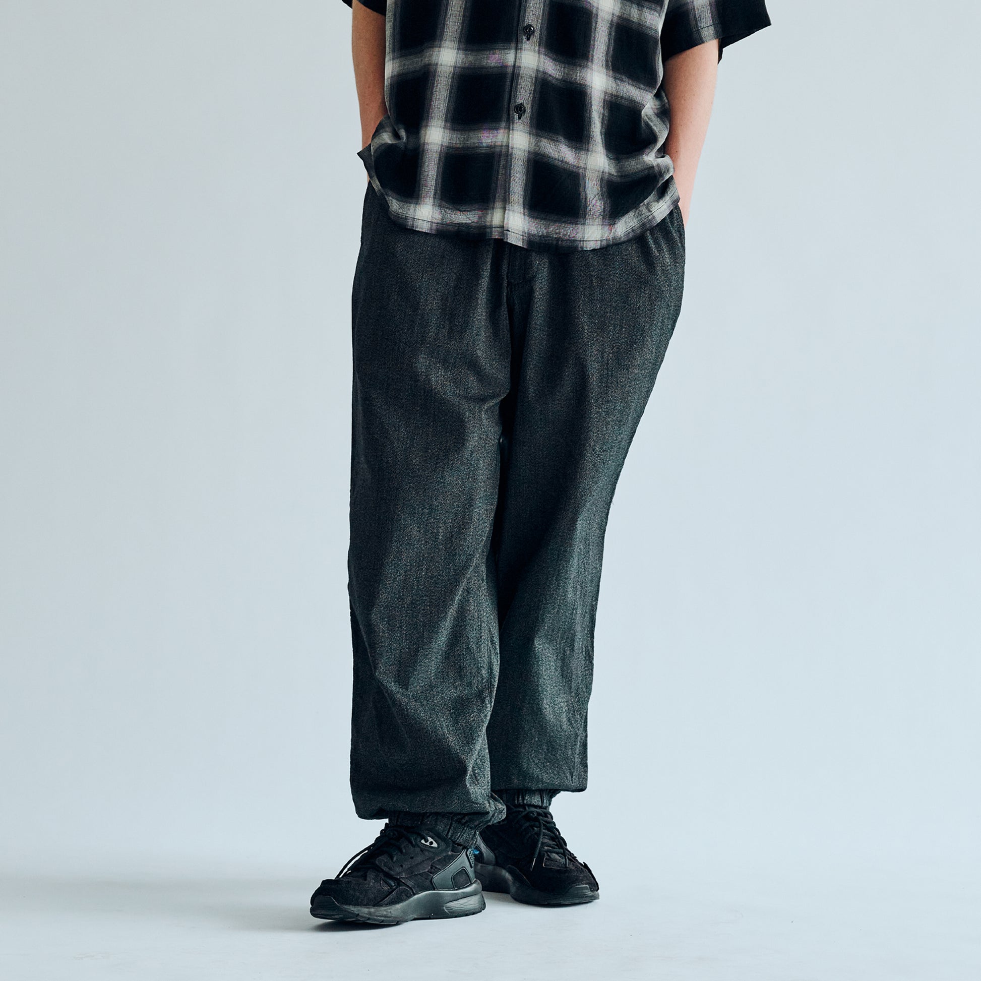 色糸と白糸を撚り合せた杢シャンブレー素材を使用したイージーパンツ。30番手の膨らみに特化した特殊なムラ糸をシャトル織機で織り上げている。柔らかな肌触りと軽さが特徴で、ポケット口布部分にセルビッジを使用している。