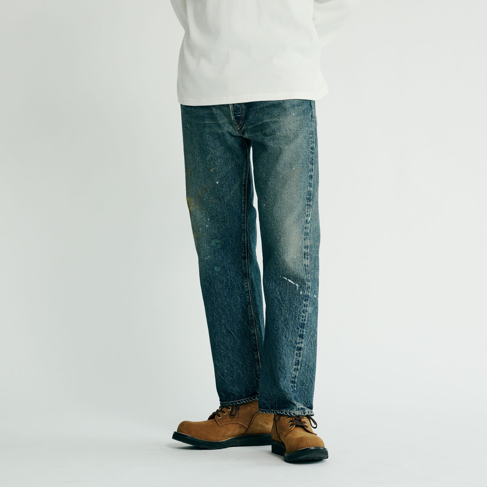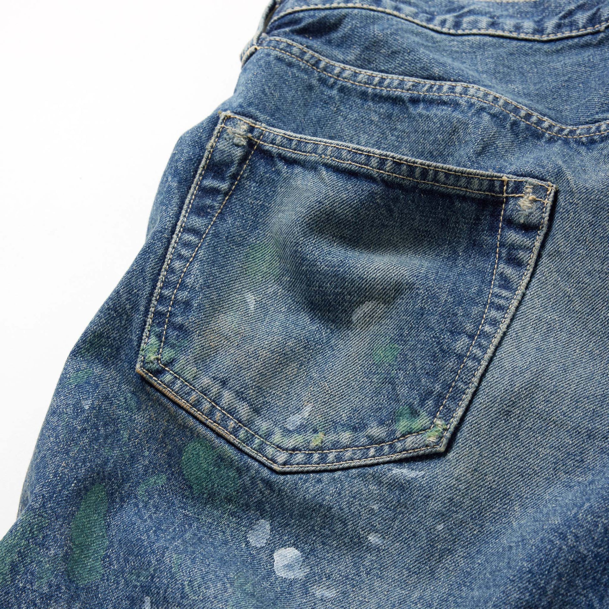 型は5ポケットパンツの完成型と呼ばれる1947年のモデルを踏襲。コインポケット口やサイドシームのセルビッジ使い、隠しリベット付きのディテールや縫製仕様もヴィンテージ同様。腰周りやワタリを広めに設定したワイドストレートモデル。ヴィンテージデニムジャケットを基にしたエイジングモデル。こちらはレギュラーストレートモデルで色落ちやペンキ加工を施している。