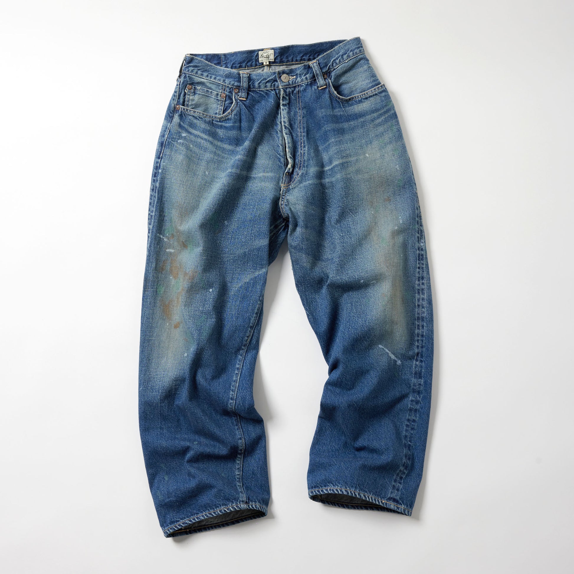 型は5ポケットパンツの完成型と呼ばれる1947年のモデルを踏襲。コインポケット口やサイドシームのセルビッジ使い、隠しリベット付きのディテールや縫製仕様もヴィンテージ同様。腰周りやワタリを広めに設定したワイドストレートで色落ちや汚し、ペンキ加工を施したモデル。