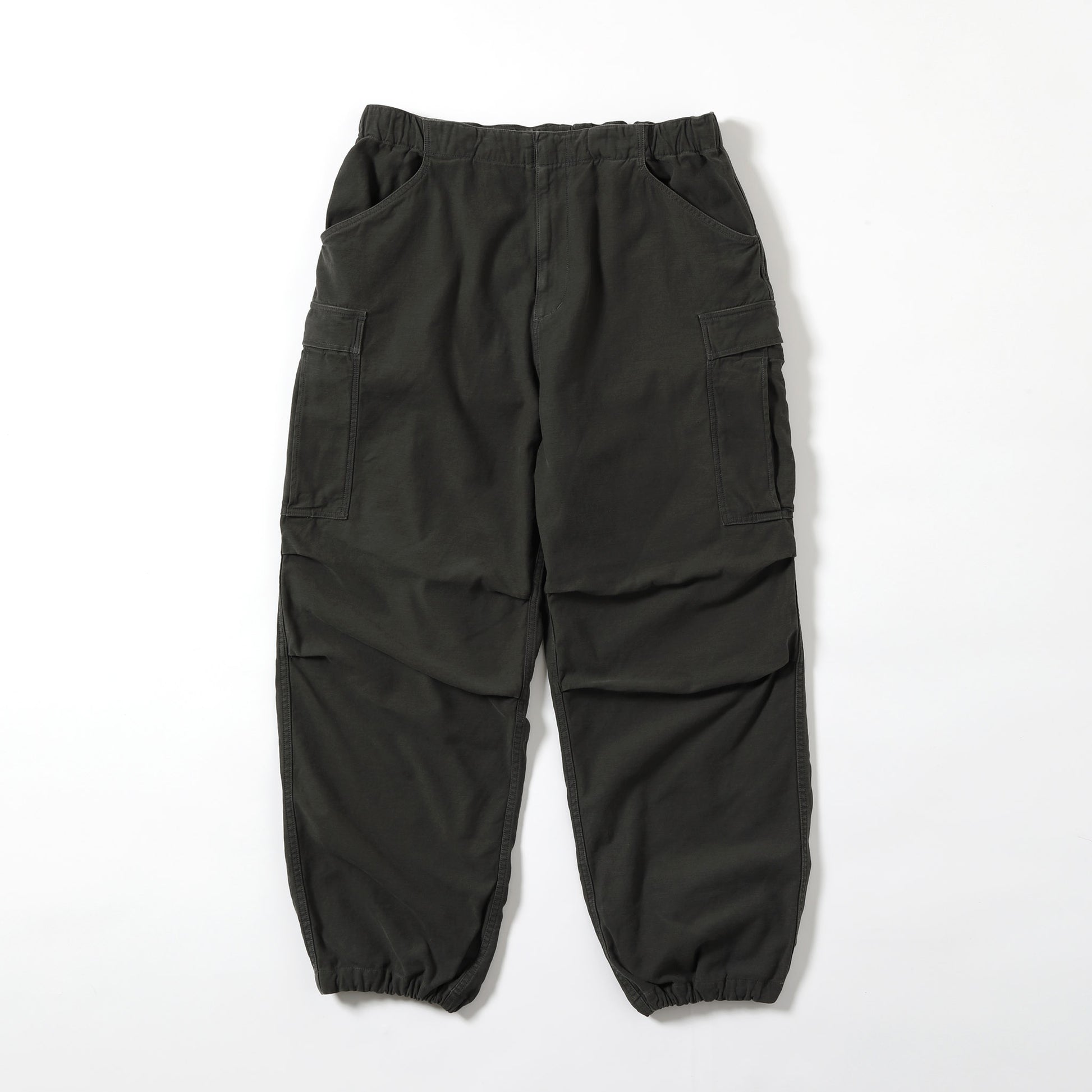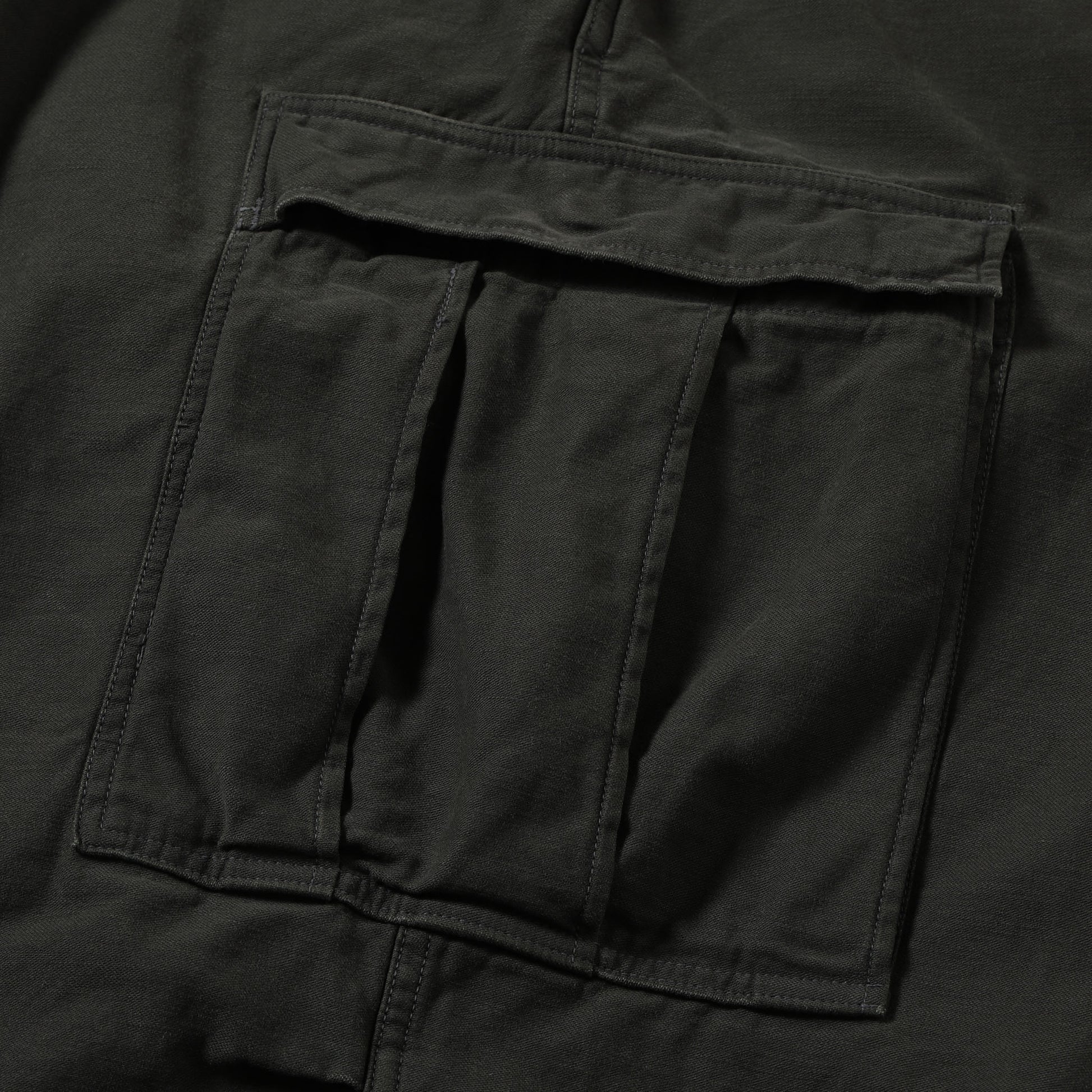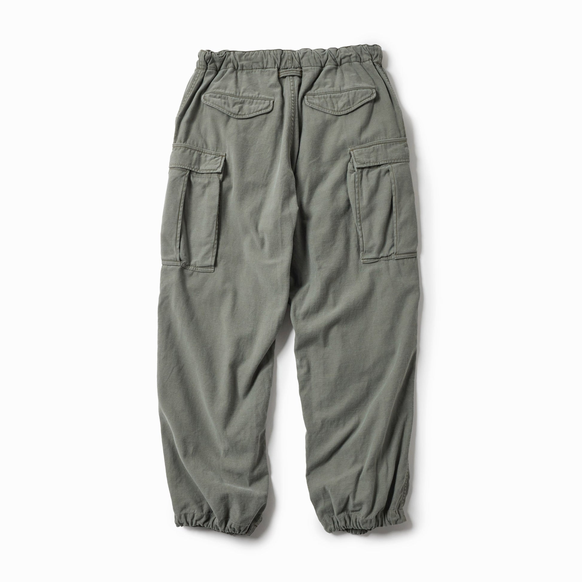 タテ糸16番×ヨコ糸10番のムラ糸で甘く織り上げられたバックサテン生地は、1950年代の朝鮮戦争時に米国陸軍に導入された素材。シャトル織機で織り上げている為、生地の柔らかさと風合いに優れた素材となっている。M-51カーゴパンツをベースにし、着脱のし易いイージーパンツにアレンジしている。