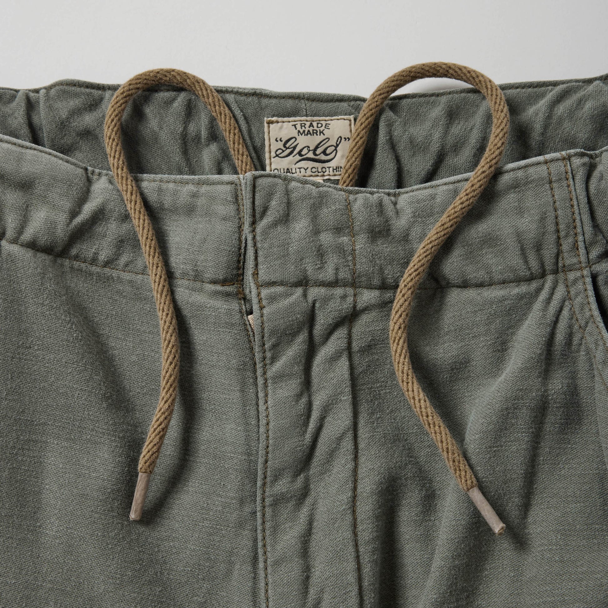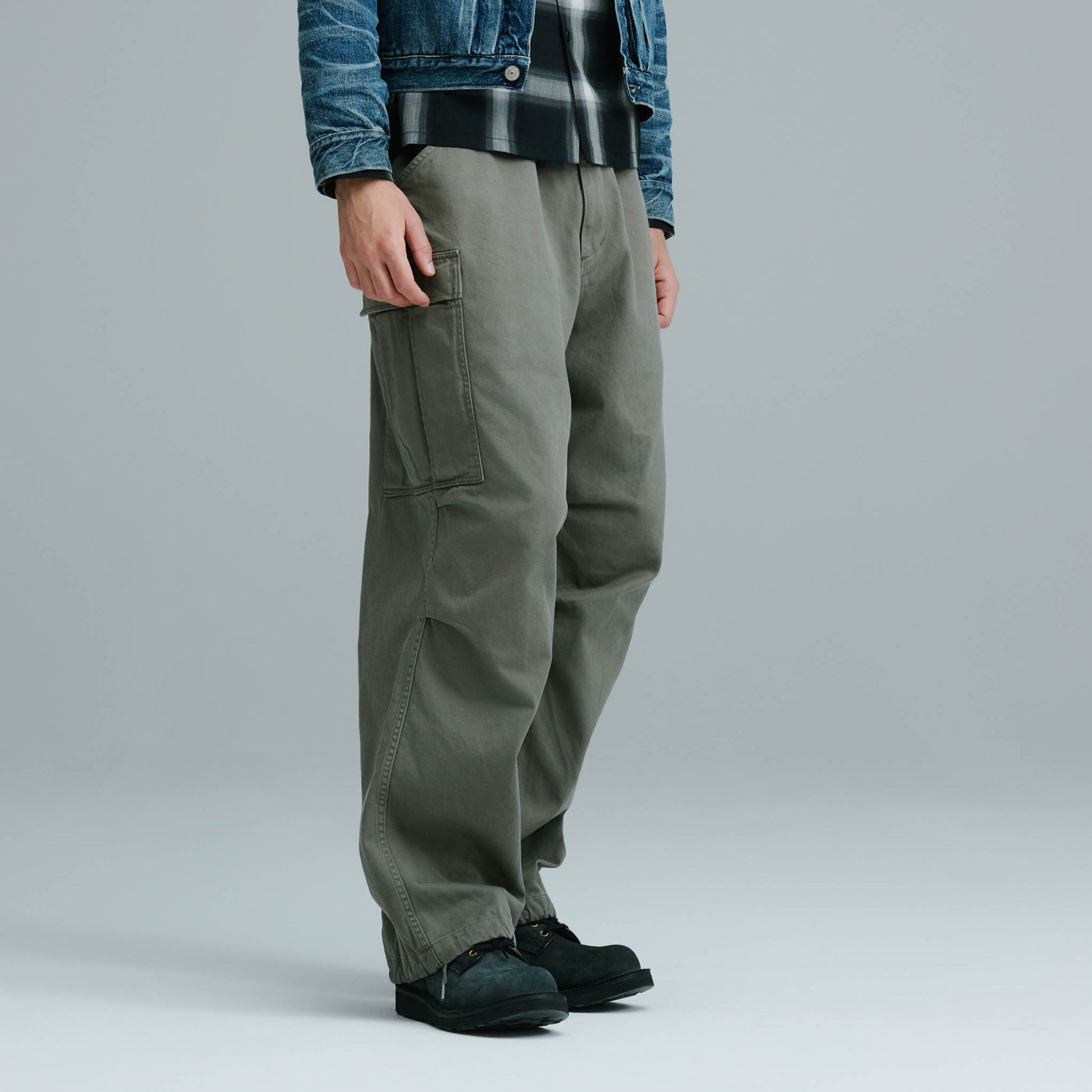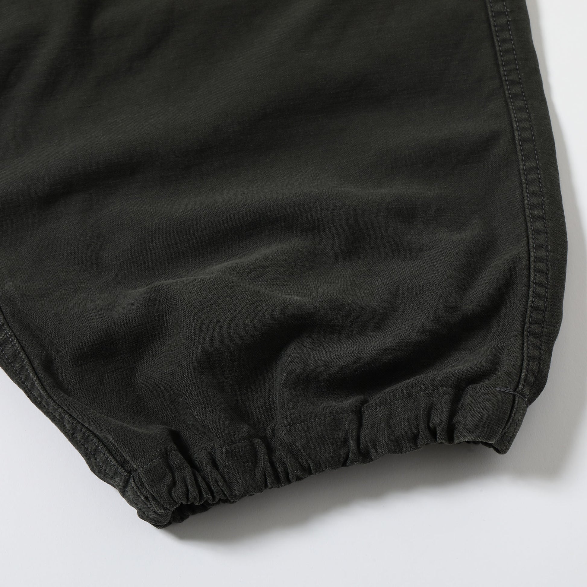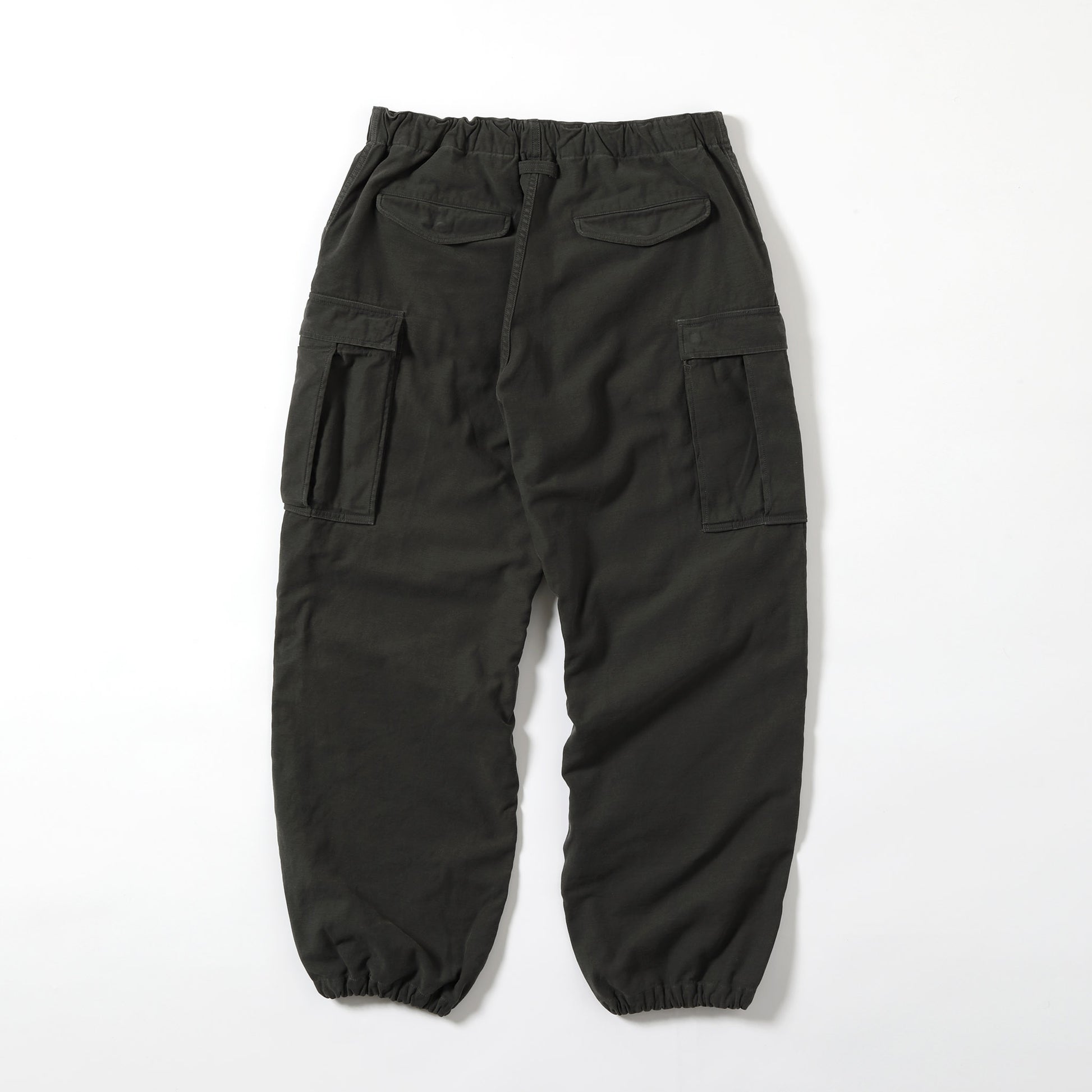 タテ糸16番×ヨコ糸10番のムラ糸で甘く織り上げられたバックサテン生地は、1950年代の朝鮮戦争時に米国陸軍に導入された素材。シャトル織機で織り上げている為、生地の柔らかさと風合いに優れた素材となっている。M-51カーゴパンツをベースにし、着脱のし易いイージーパンツにアレンジしている。