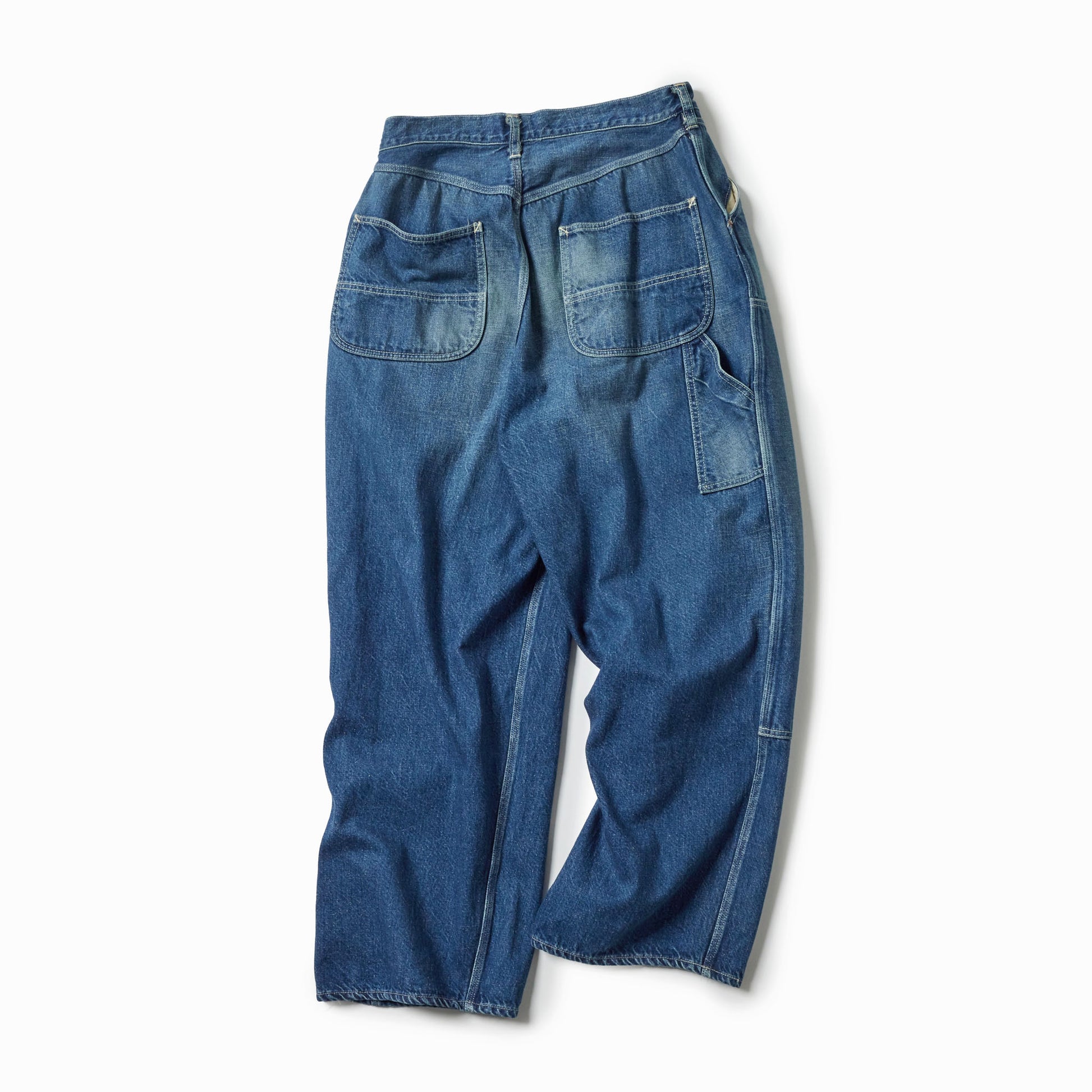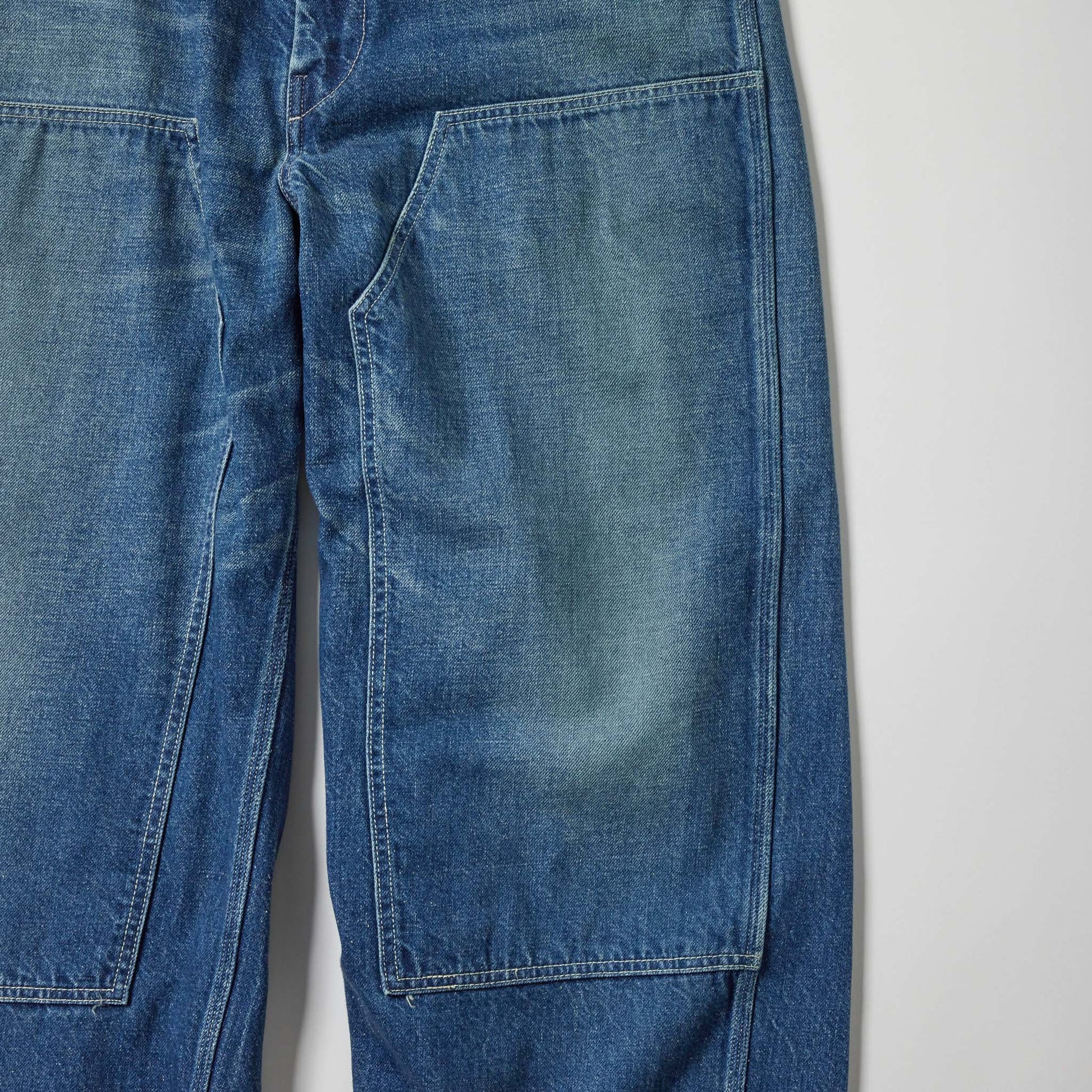 型は1960年代のヴィンテージペインターパンツがベース。フロントトップは刻印入りのスナップボタン、ポケット底の当て布やハンマーポケット付きのディテール、強度の高い3本針巻き縫いの縫製仕様などヴィンテージペインターパンツのディテールを踏襲している。ヴィンテージを基に色落ち加工が施されている。