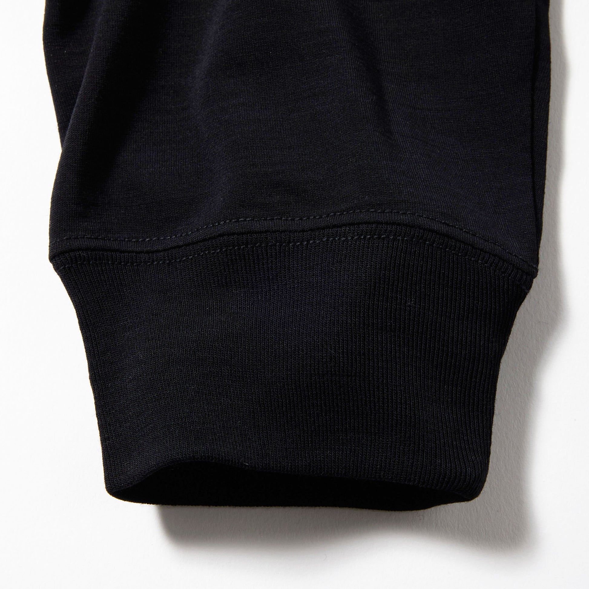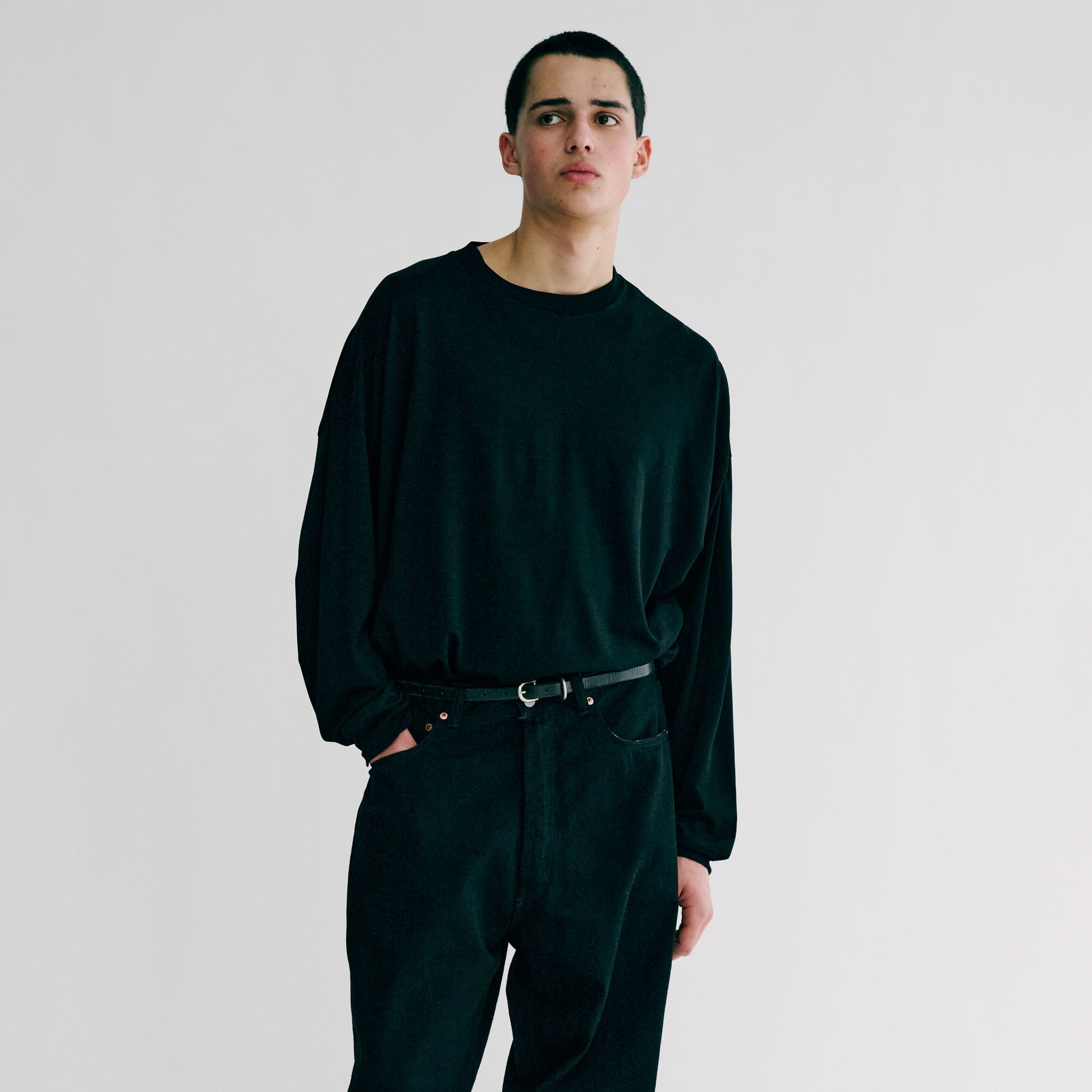 1/48番のウールを使用してオリジナルで編み上げたウール 100%の天竺は、肌触りの良さに加え、洗濯での斜行や縮みのないよう強撚糸を使用。防臭や抗菌にも優れている。肩幅、身幅を広めに設定し、裾にかけてしぼまったシルエットが特徴。