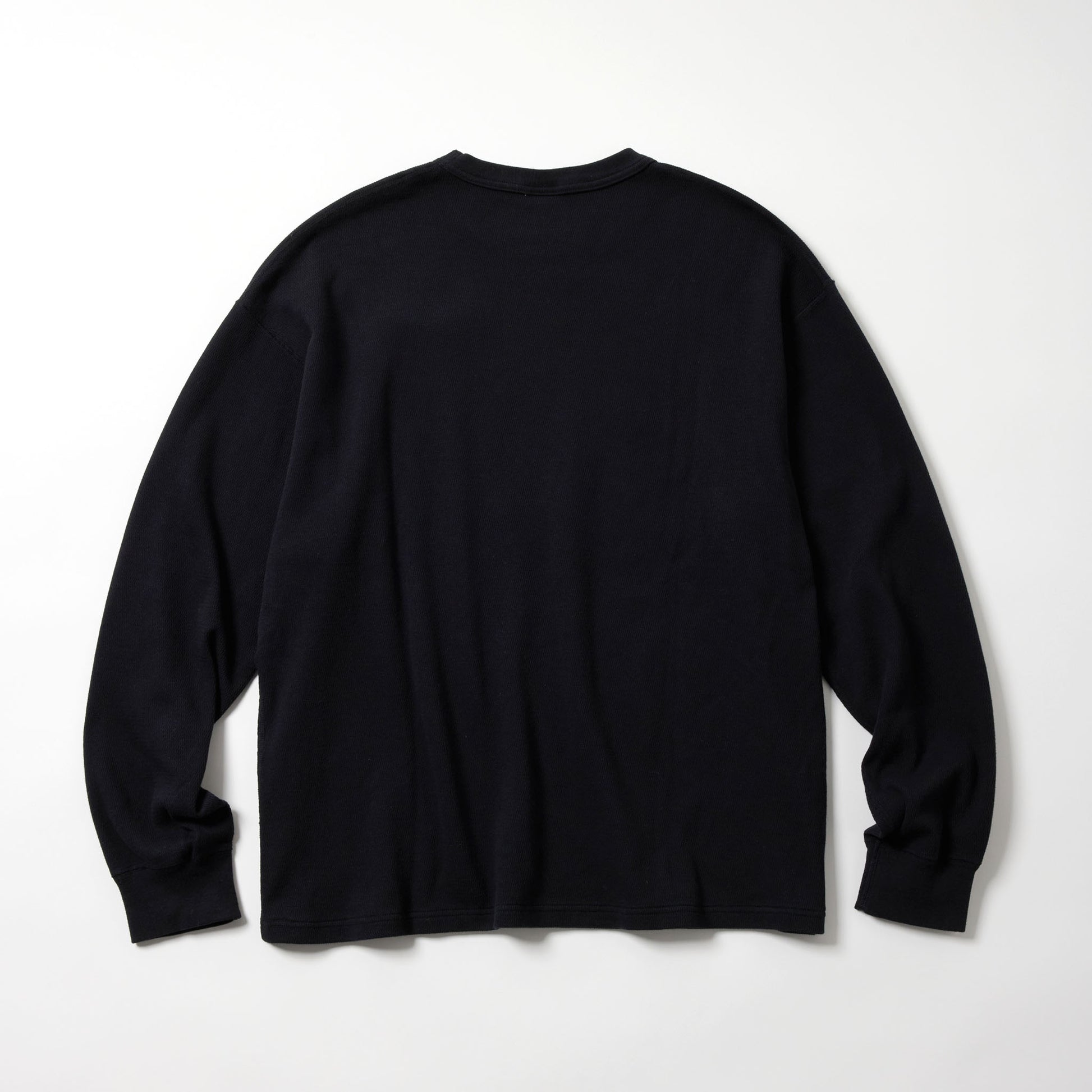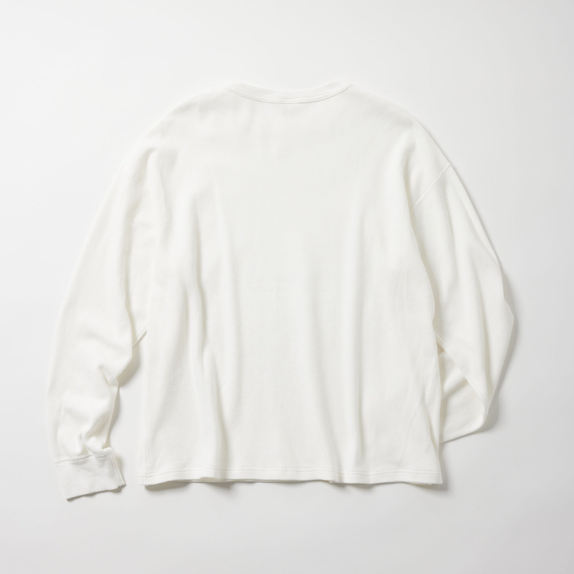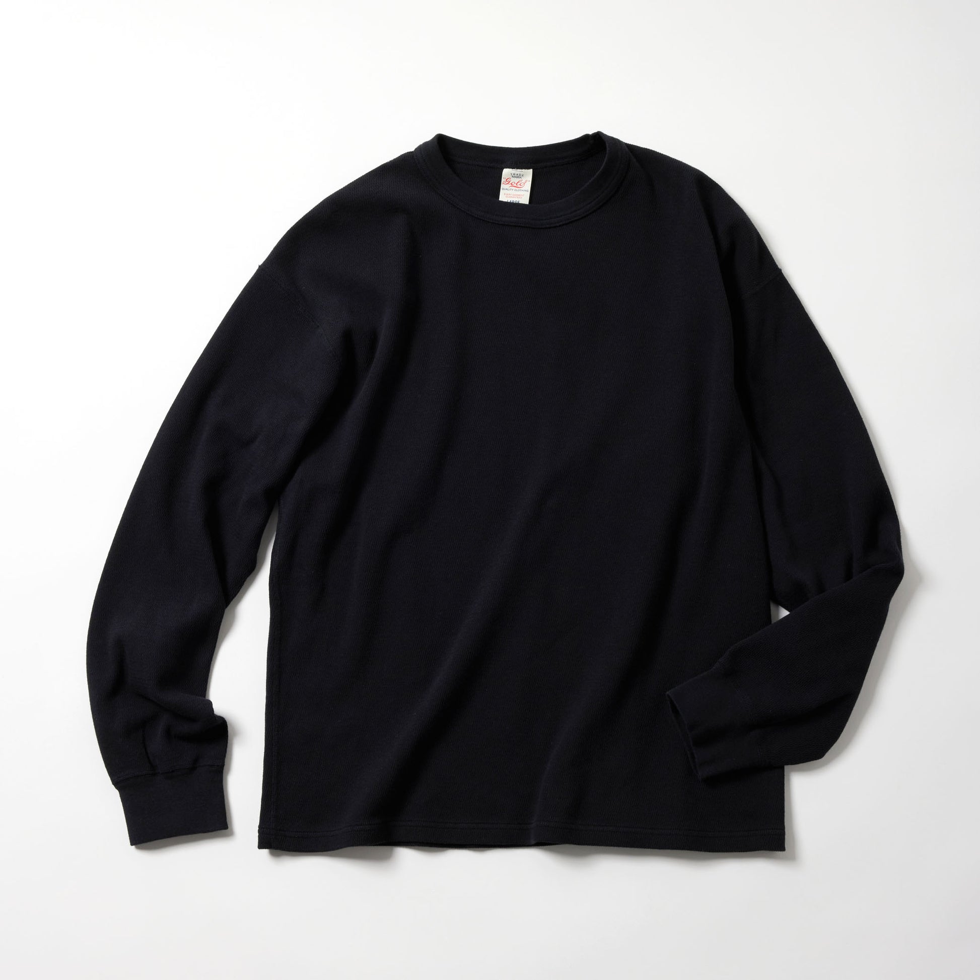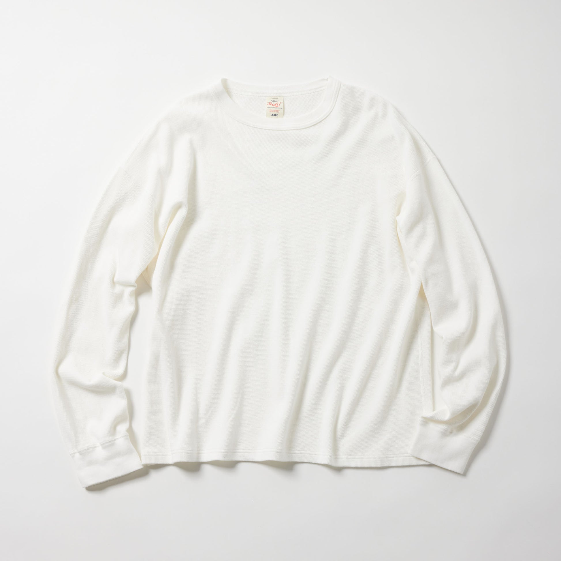 30番手単糸で編み上げたライトサーマル素材。定番のレギュラーシルエットのロングスリーブTシャツは、軍サーマル同様に、4本針フラットシーマの縫製仕様を採用している。