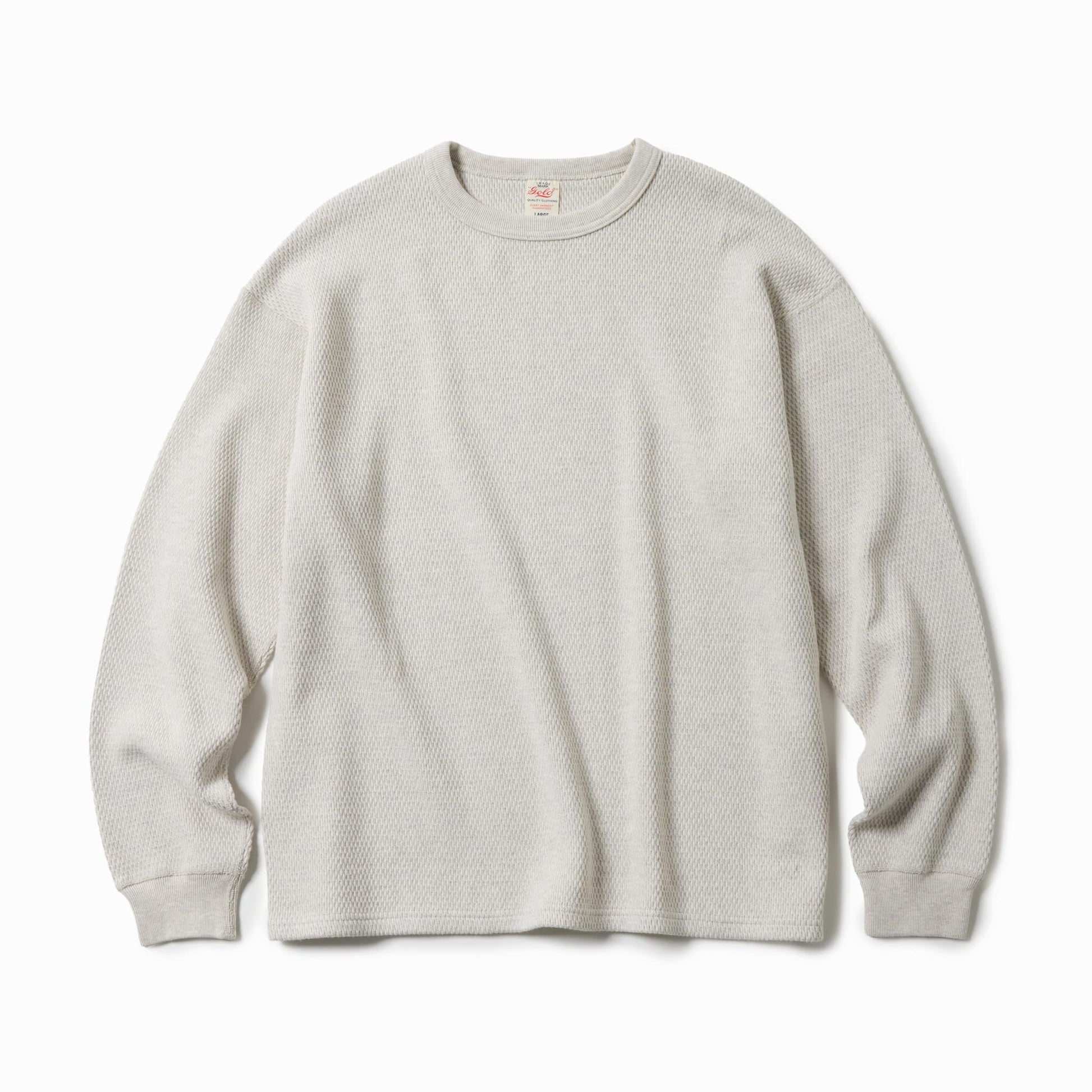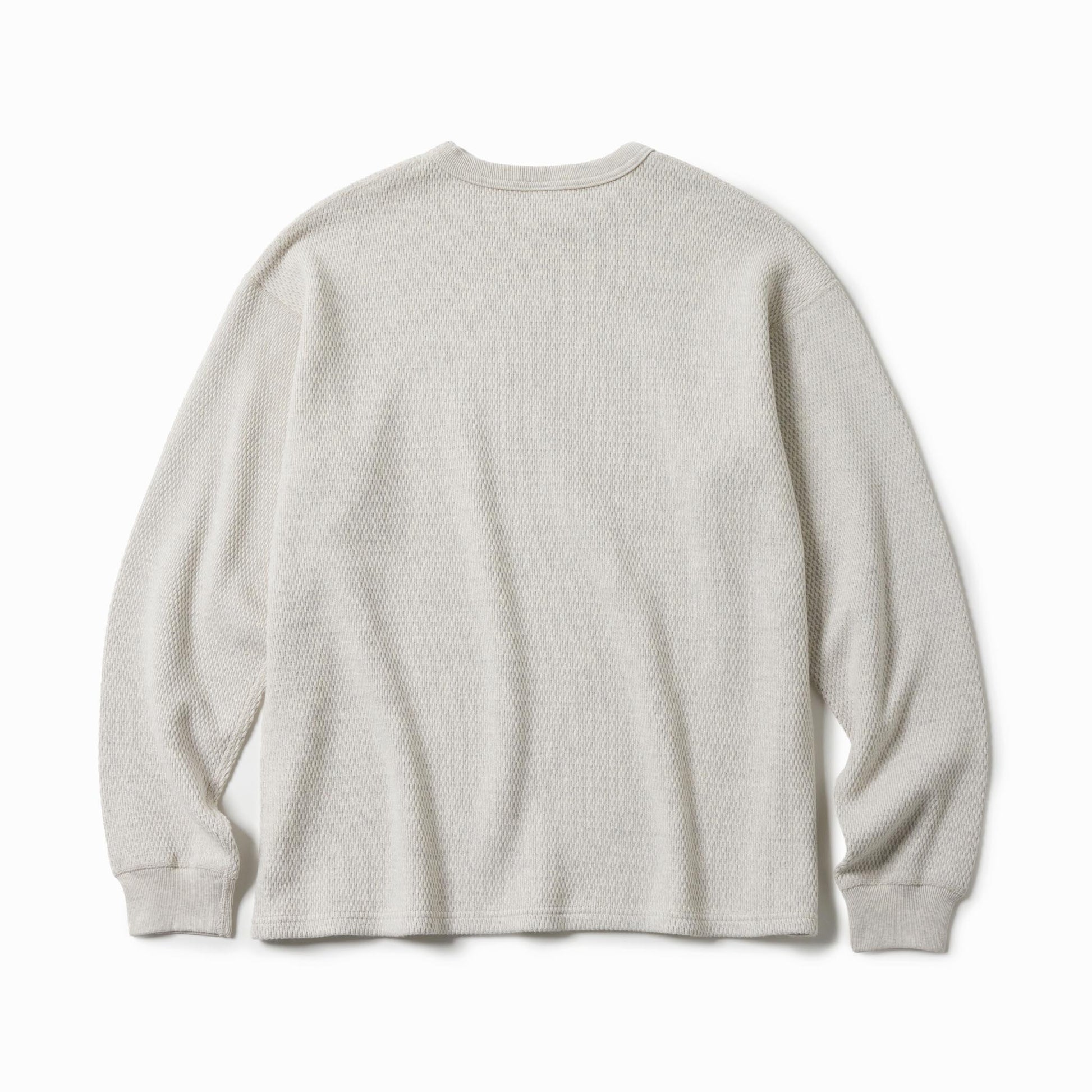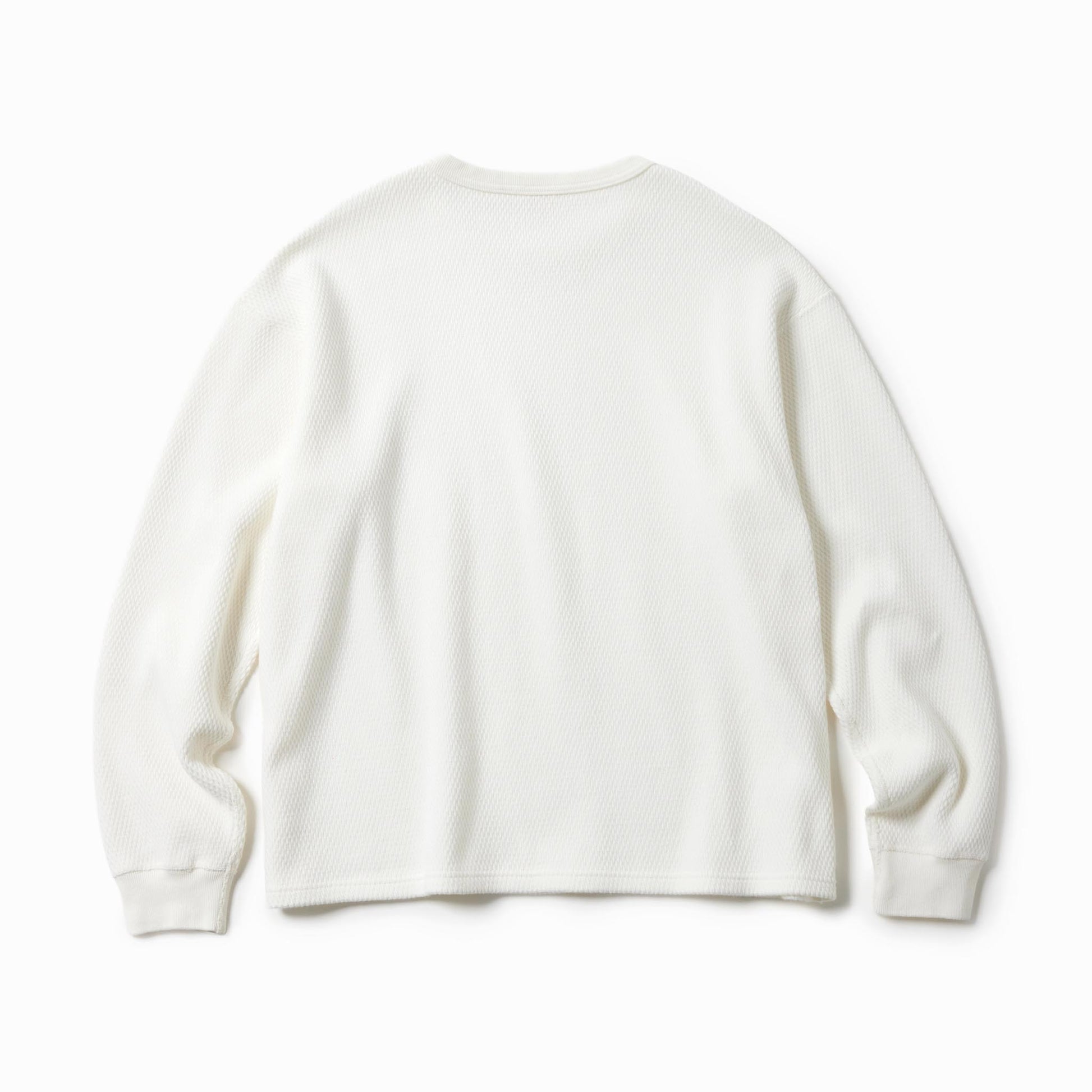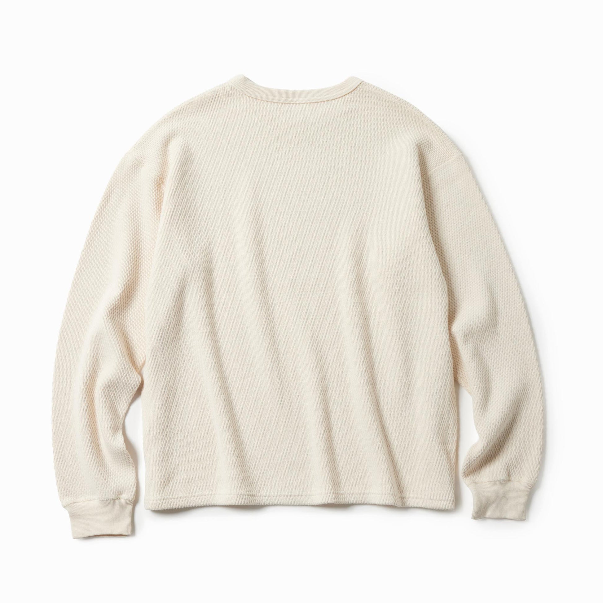 サーマル素材特有の生地の斜行やねじれ、伸縮を抑えるため、20番手単糸を3本取りで編み上げたヘビーサーマル素材を使用。定番のレギュラーシルエットのロングスリーブTシャツは、軍サーマルのフラットシーマ(4本針)の縫製仕様を採用している。
