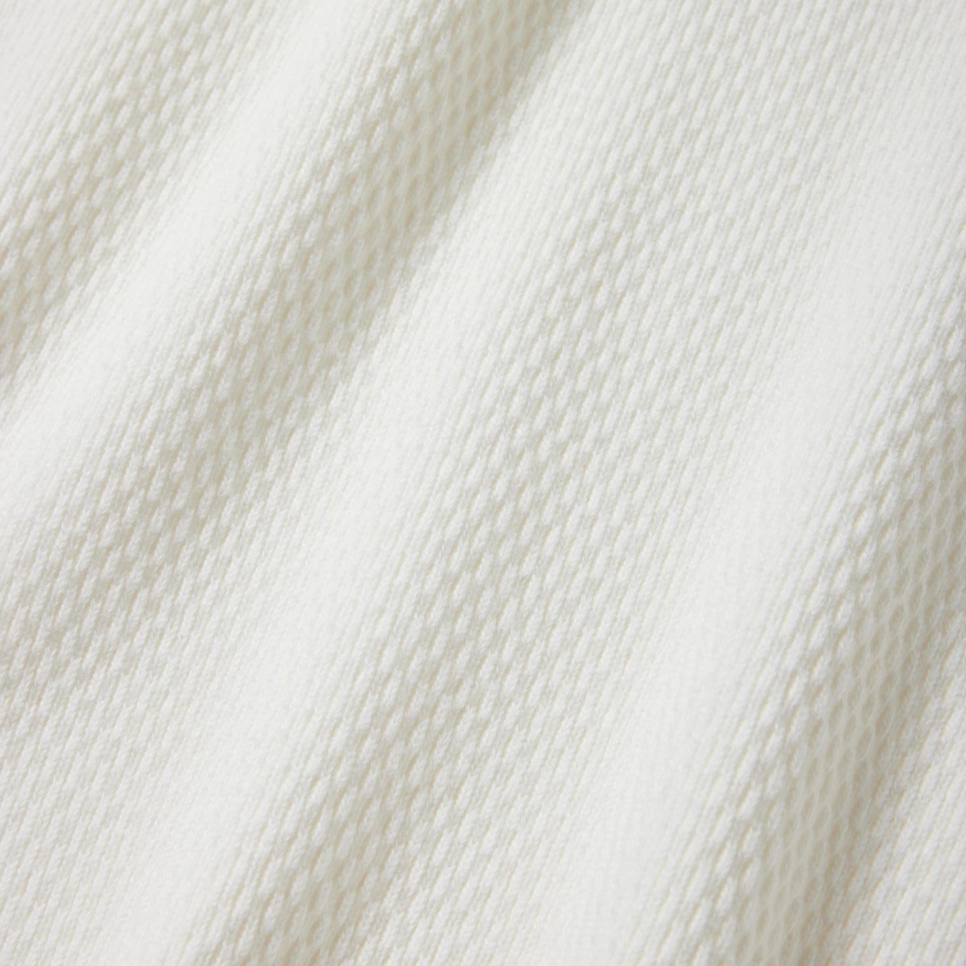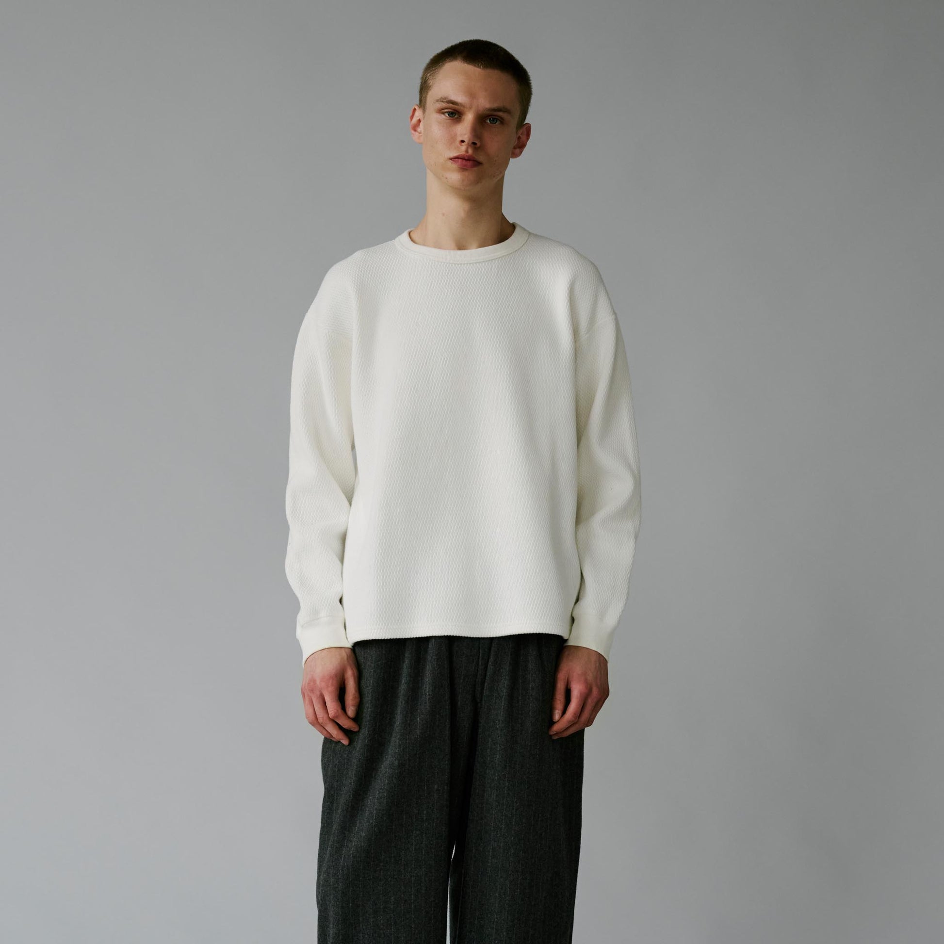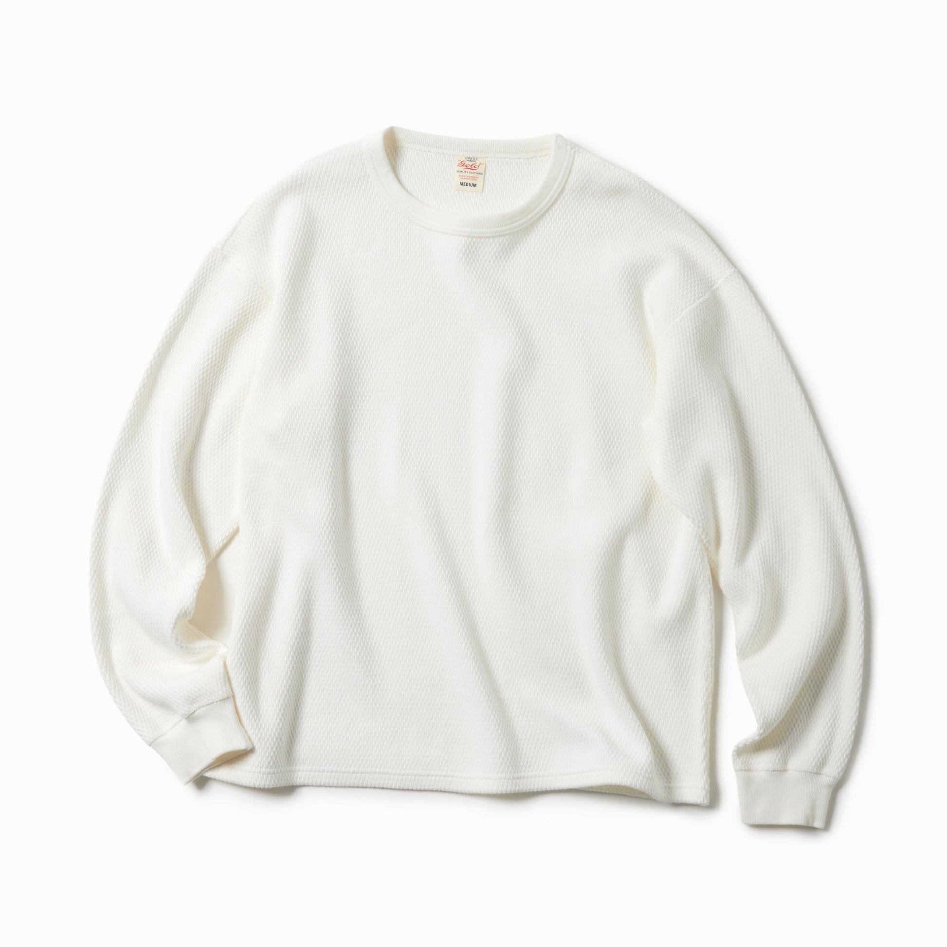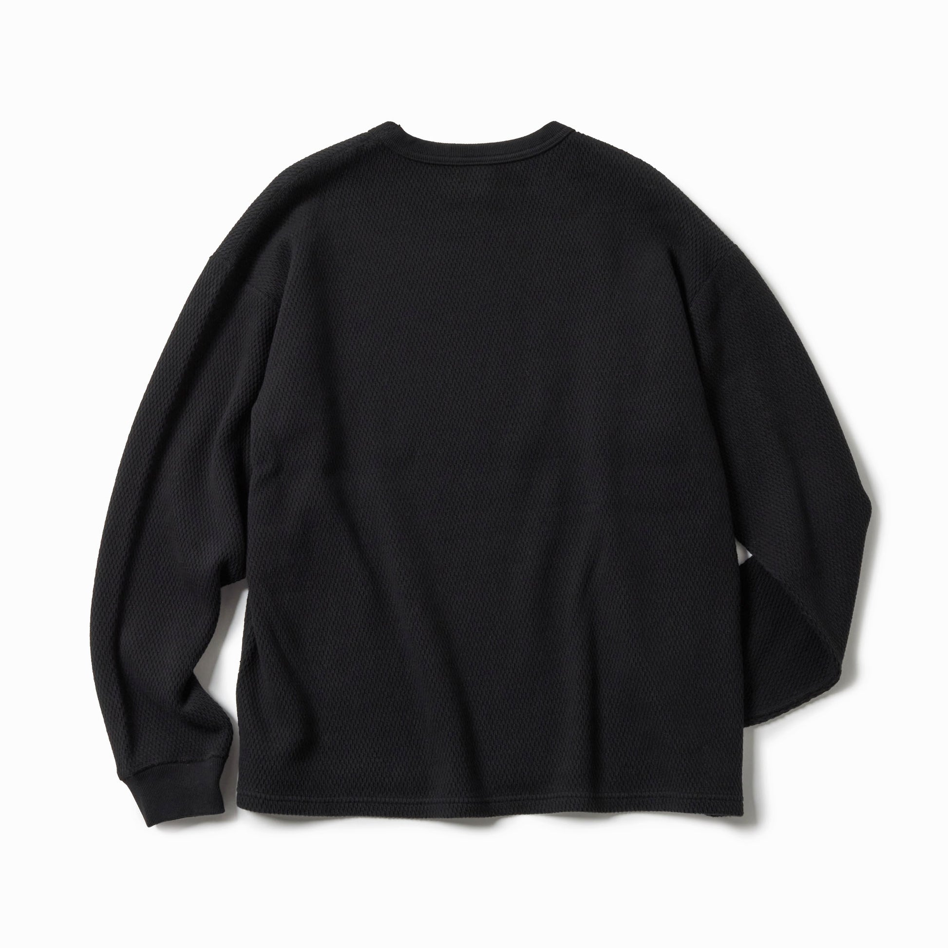 サーマル素材特有の生地の斜行やねじれ、伸縮を抑えるため、20番手単糸を3本取りで編み上げたヘビーサーマル素材を使用。定番のレギュラーシルエットのロングスリーブTシャツは、軍サーマルのフラットシーマ(4本針)の縫製仕様を採用している。