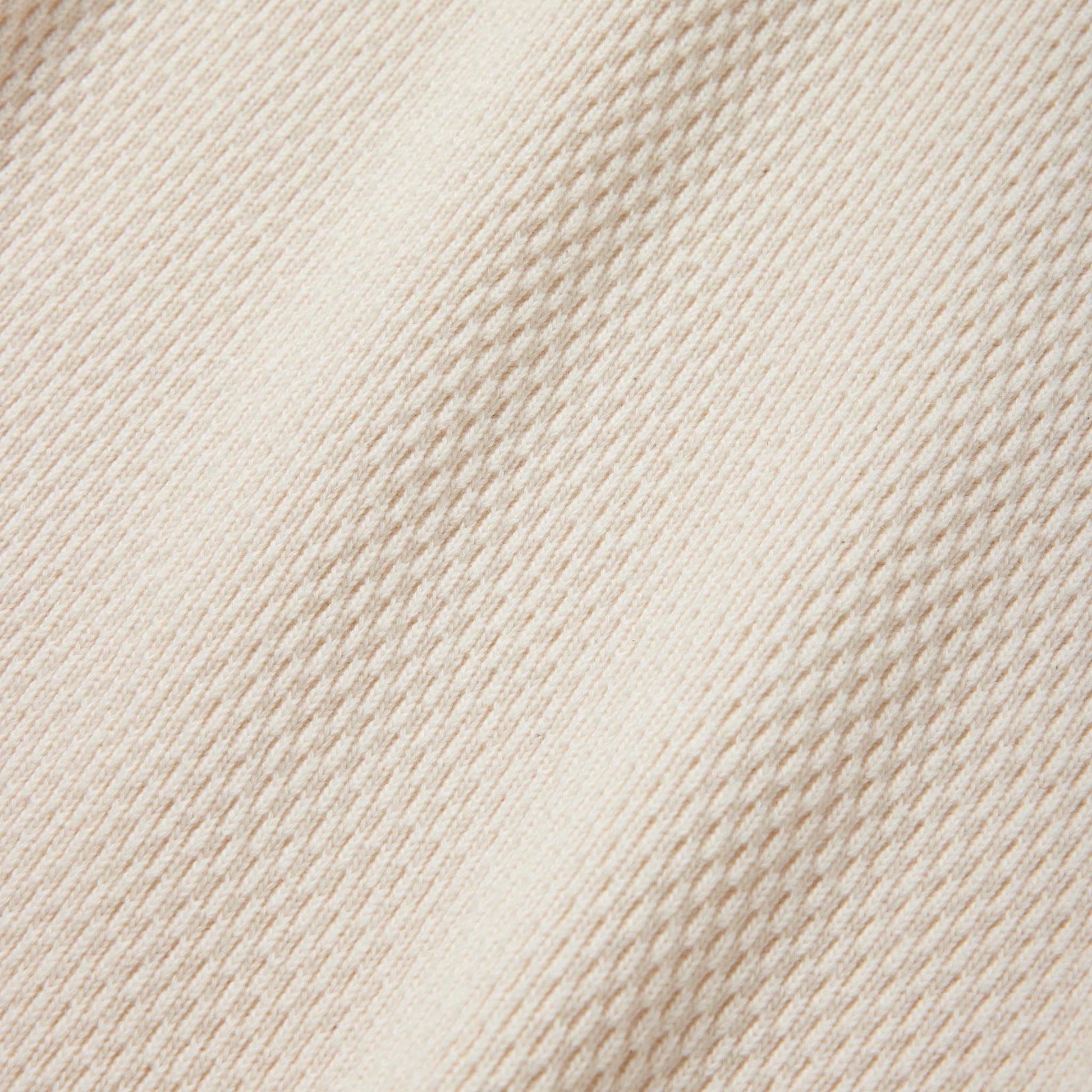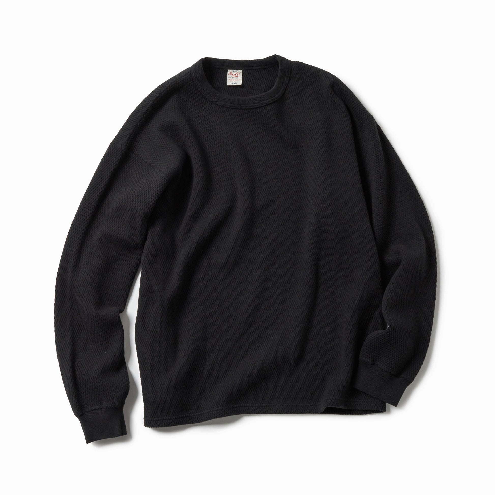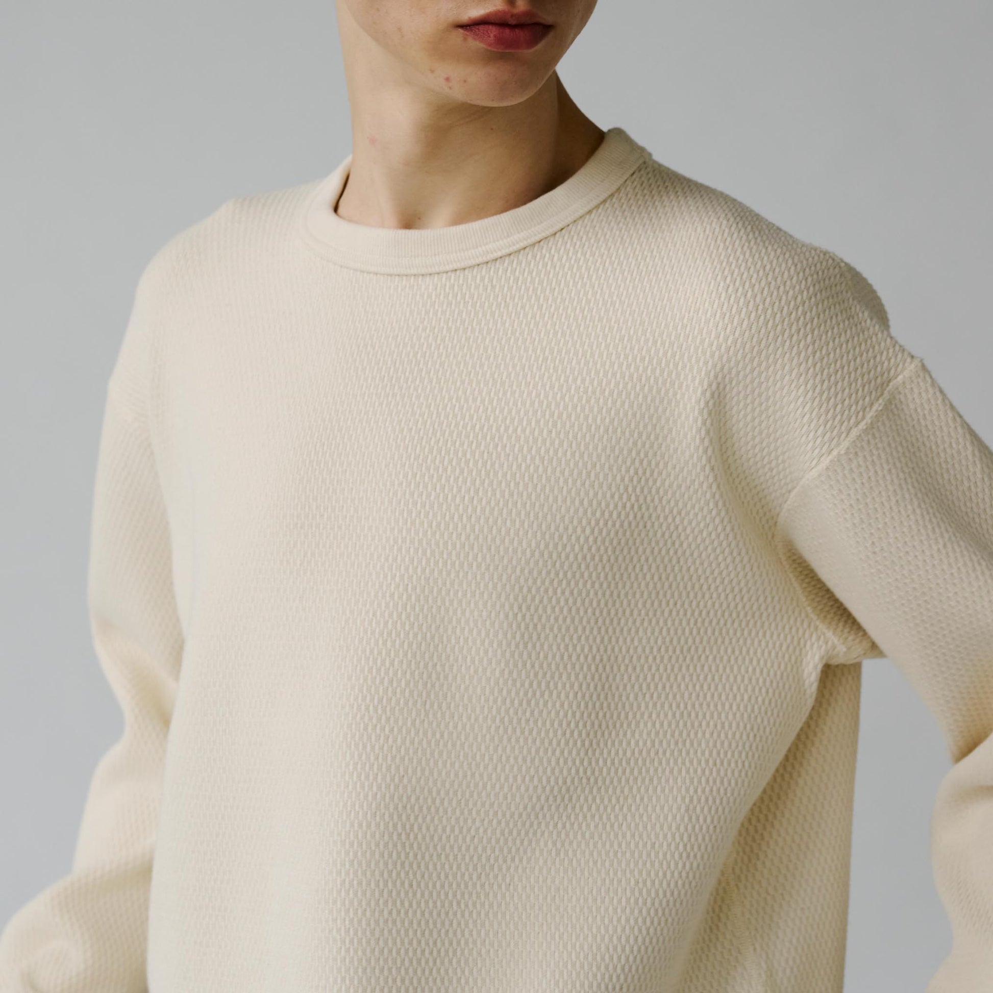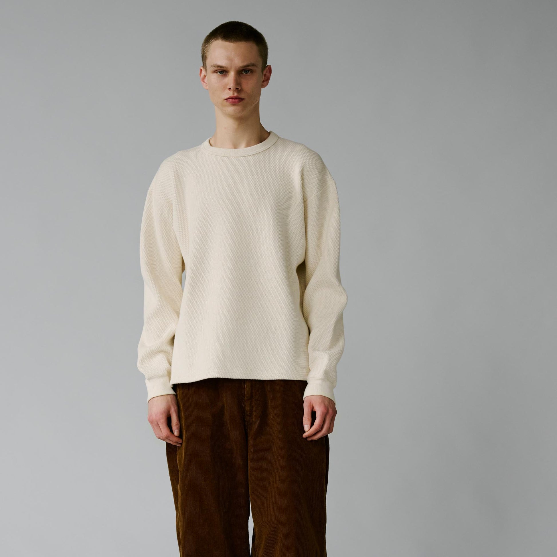 サーマル素材特有の生地の斜行やねじれ、伸縮を抑えるため、20番手単糸を3本取りで編み上げたヘビーサーマル素材を使用。定番のレギュラーシルエットのロングスリーブTシャツは、軍サーマルのフラットシーマ(4本針)の縫製仕様を採用している。