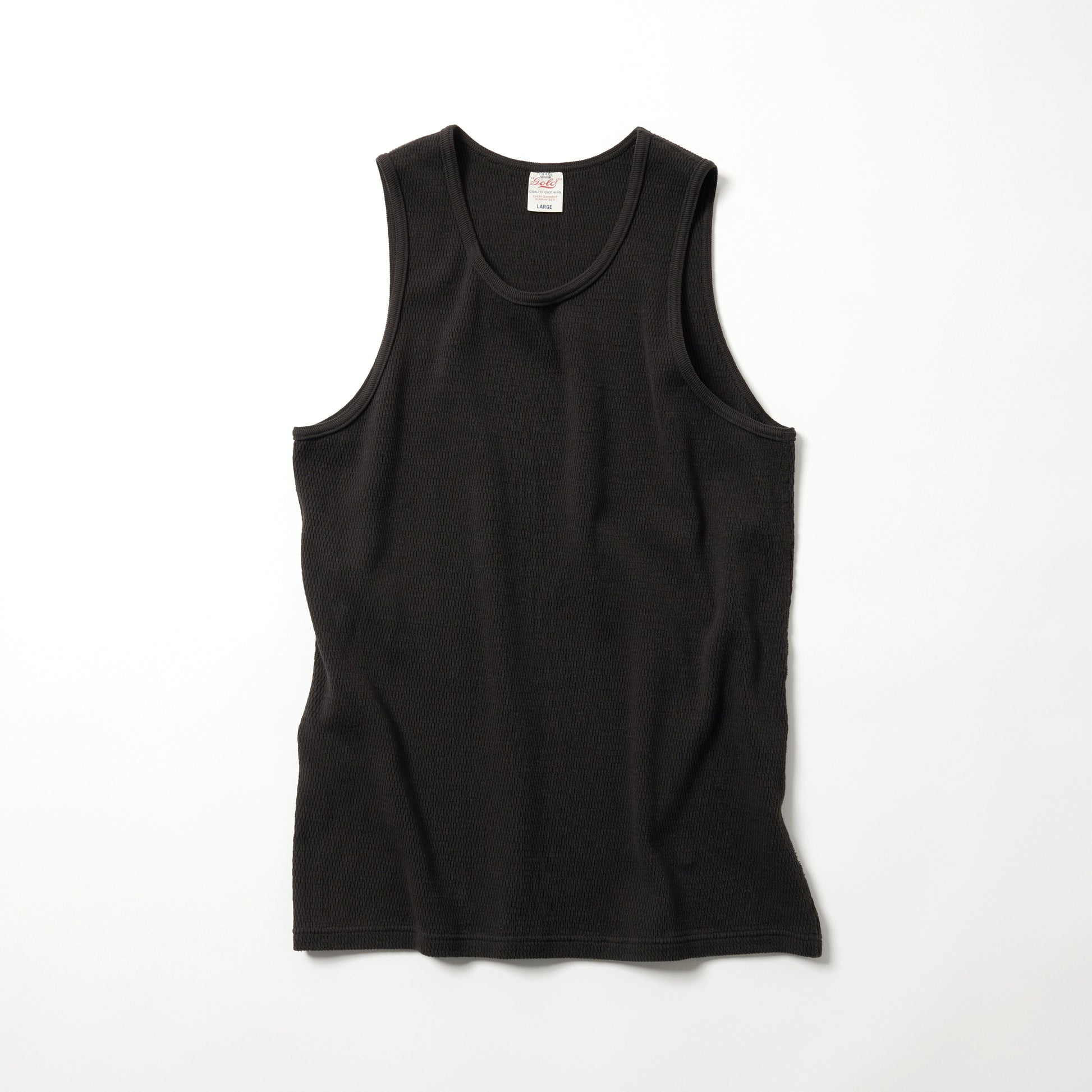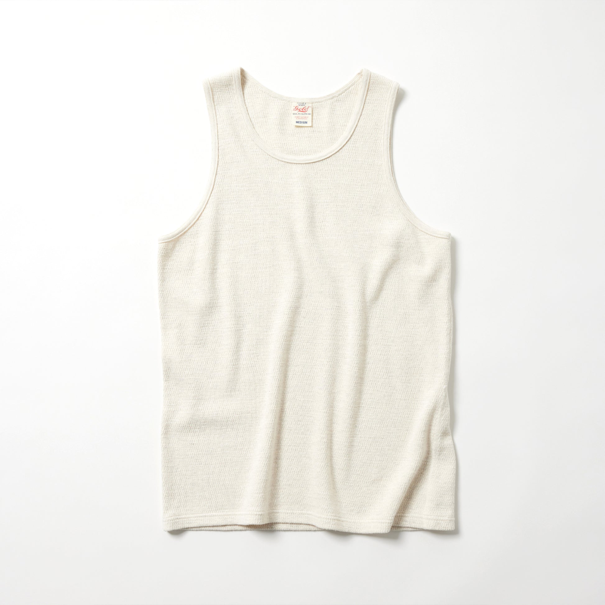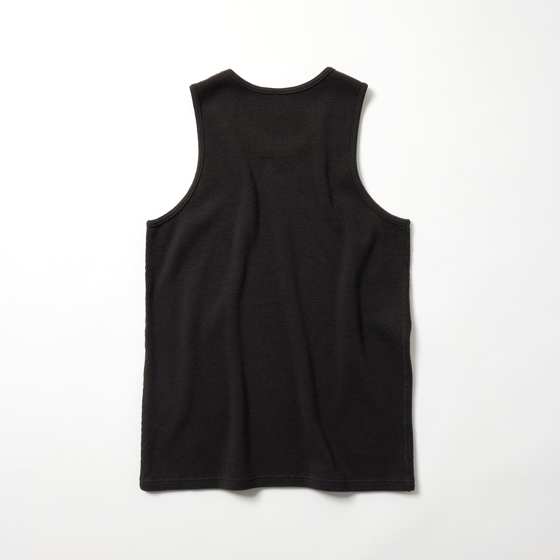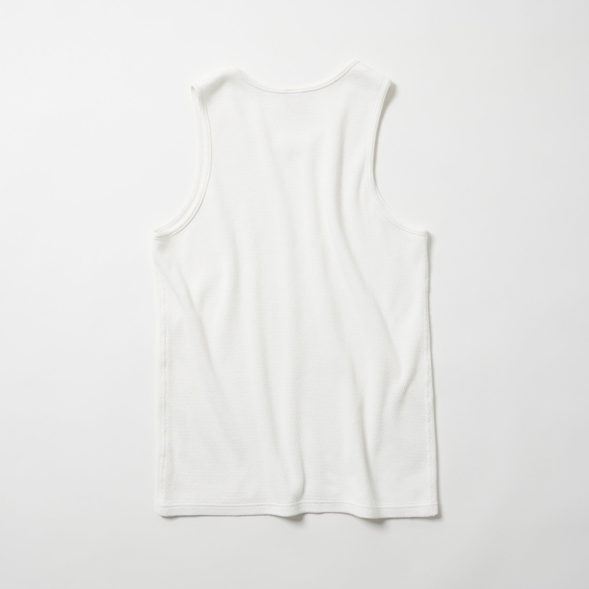 サーマルを使用したタンクトップは、裾がフラットのデザイン。絶妙な幅の首まわりやアームホールはインナー使いに最適なアイテム。、軍サーマル同様にフラットシーマ(4本針)の縫製仕様を採用している。